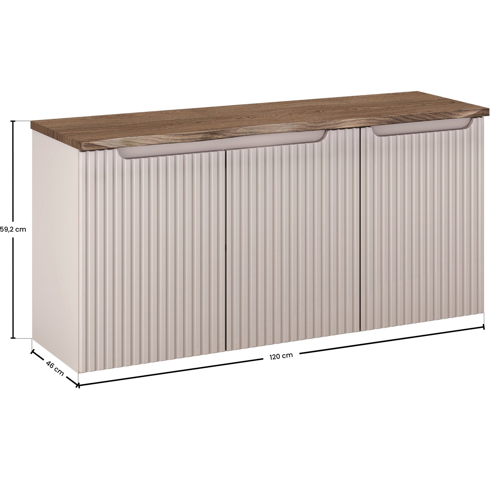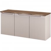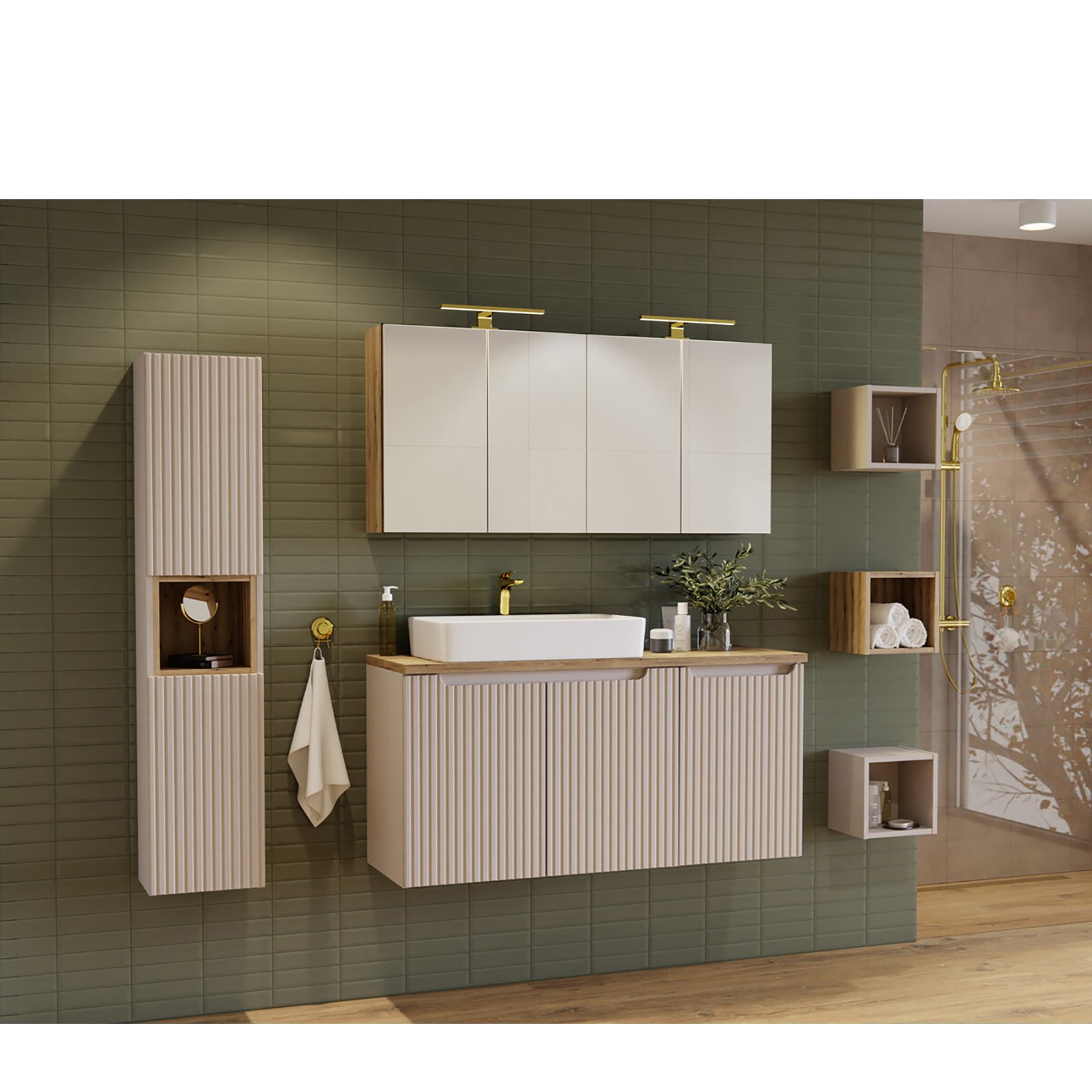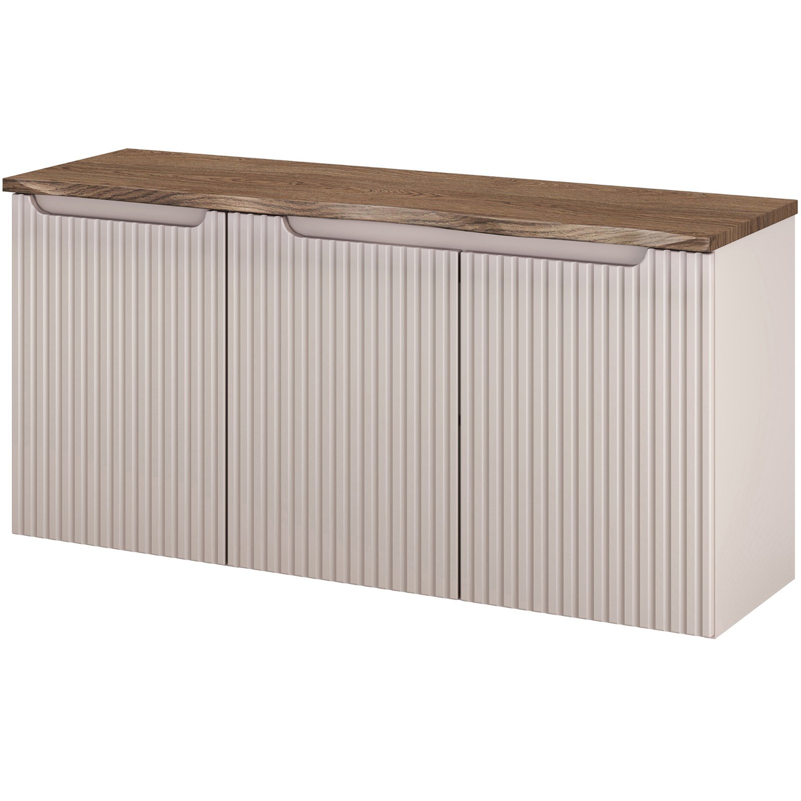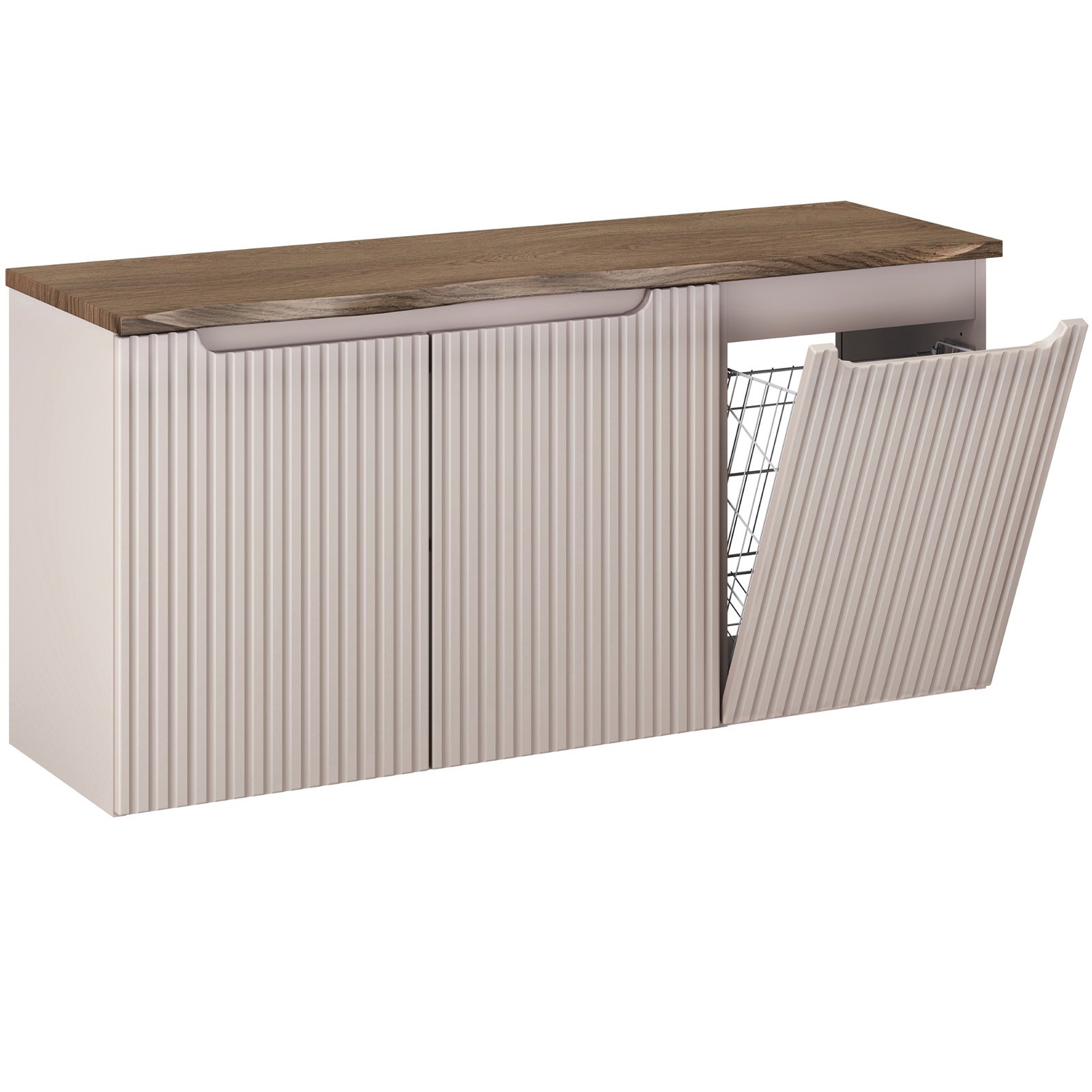 Zestaw mebli Nova Cashmere, łączy minimalistyczny design z funkcjonalnością. Pionowe, ryflowane fronty nadają meblom unikalny charakter i optycznie powiększają przestrzeń łazienki, a kaszmirowy kolor dodaje subtelnego ciepła, doskonale komponując się z różnorodnymi aranżacjami wnętrz. Blat z kolekcji Nature to propozycja inspirowana prawdziwym drewnem – jego nieregularna, lekko falowana krawędź imituje naturalnie cięty kawałek drewna, nadając wnętrzu autentyczny i przytulny klimat.