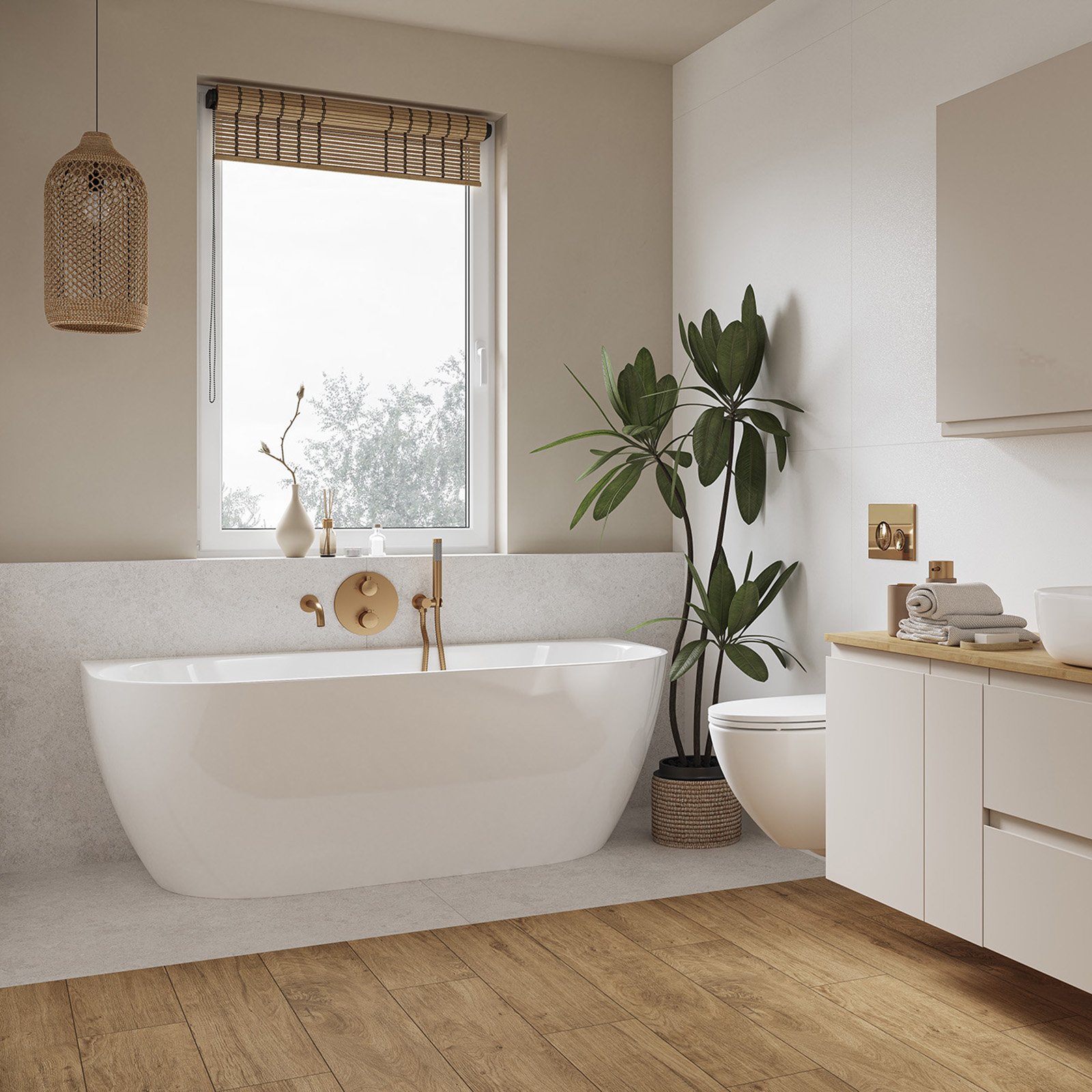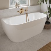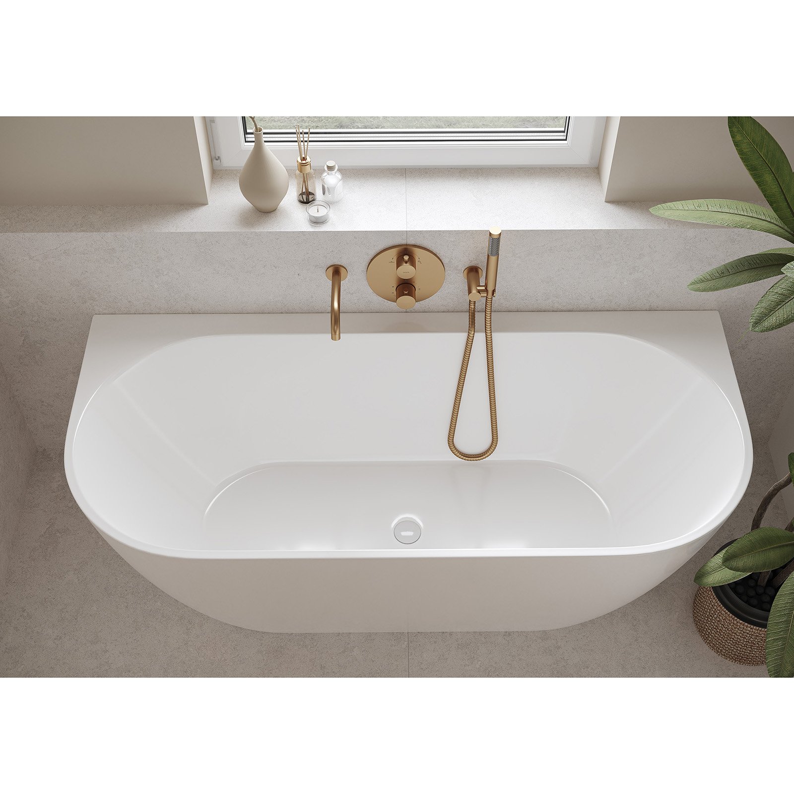 Przyścienna wanna wolnostojąca GARDA to rozwiązanie dla osób pragnących połączyć monolityczne piękno wanny wolnostojącej z aspektem funkcjonalnym w aranżacji przestrzeni łazienkowej. Wolnostojąca wanna przyścienna umożliwia zastosowanie zarówno armatury ściennej jak i na wannowej – możliwość wiercenia otworów w rancie wanny. Wyrób jest również wyposażony w wygodną przestrzeń na przybory kąpielowe w postaci komfortowej półki, przylegającej do ściany. Do produkcji wyrobu zastosowano doskonałej jakości akryl - materiał tłumiący dźwięk uderzającej wody i sprawiający, że powierzchnia wanny jest ciepła i przyjemna w kontakcie. Przyjemna temperatura kąpieli utrzymuje się dłużej. Poza solidną konstrukcją, wolnostojącą wannę akrylową wyróżnia waga, która jest niższa od wyrobów z konglomeratu. W komplecie znajduje się syfon klik-klak w kolorze białym oraz stelaż z regulowanymi nóżkami.