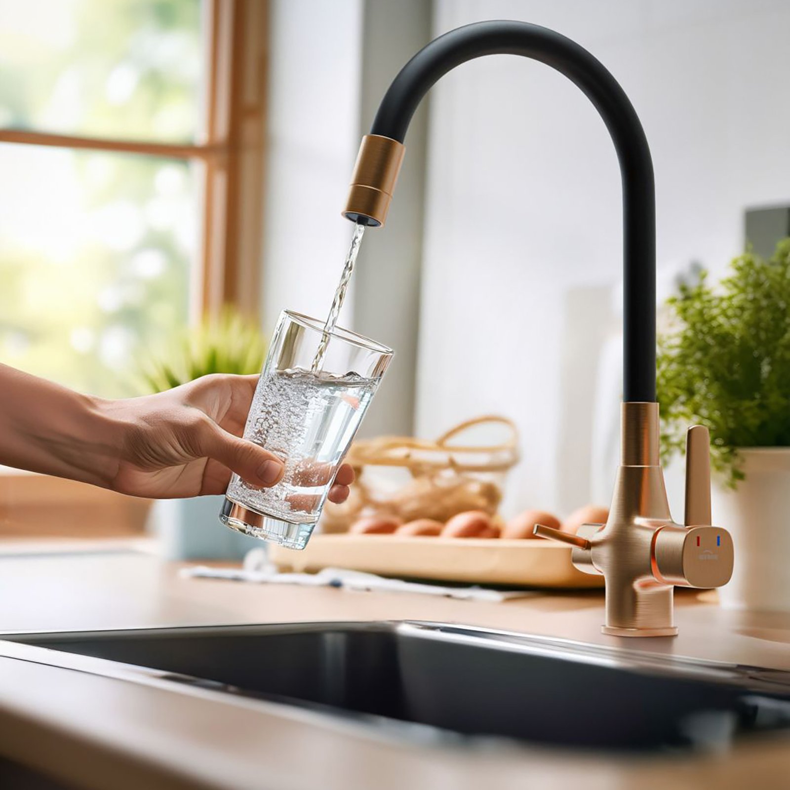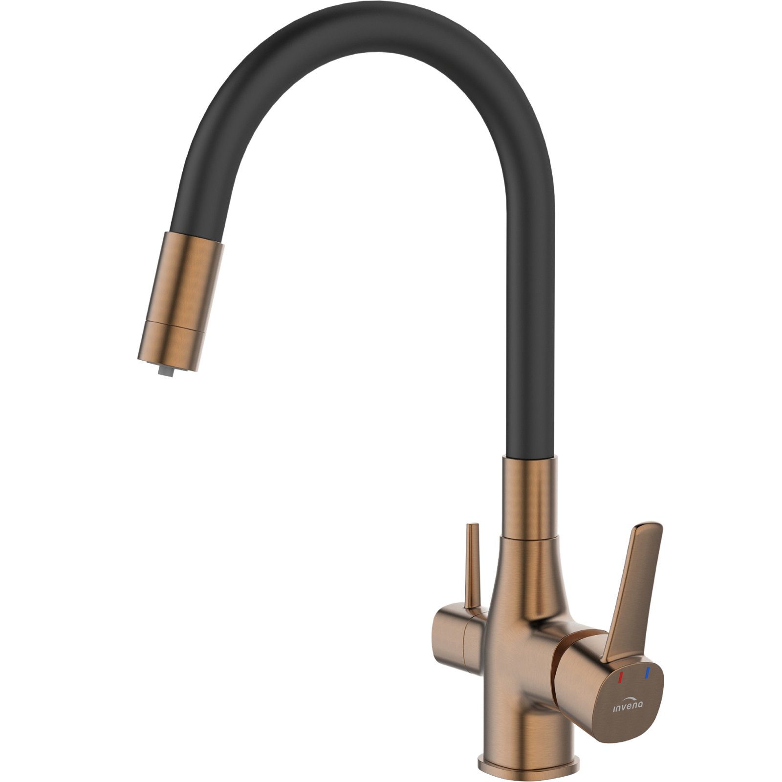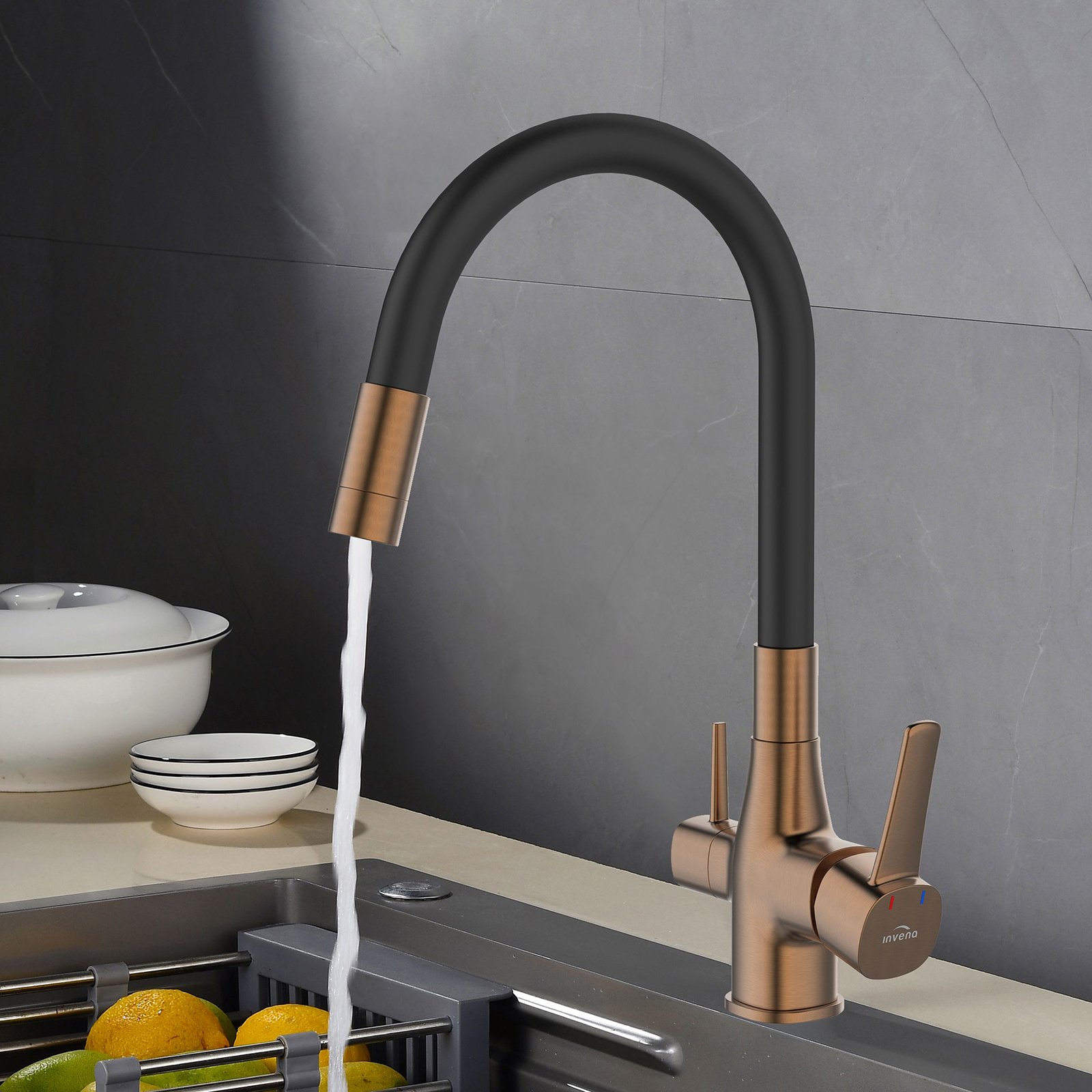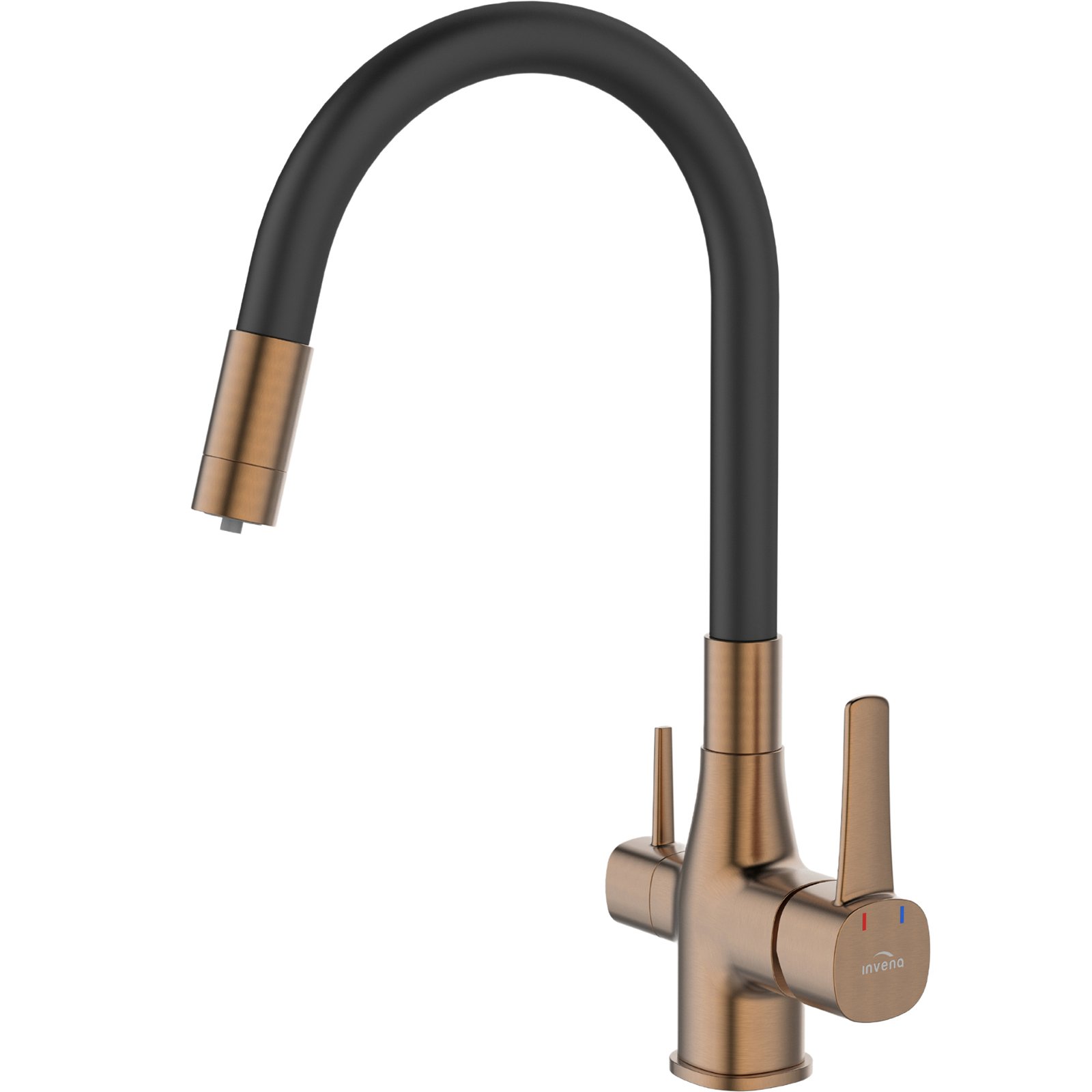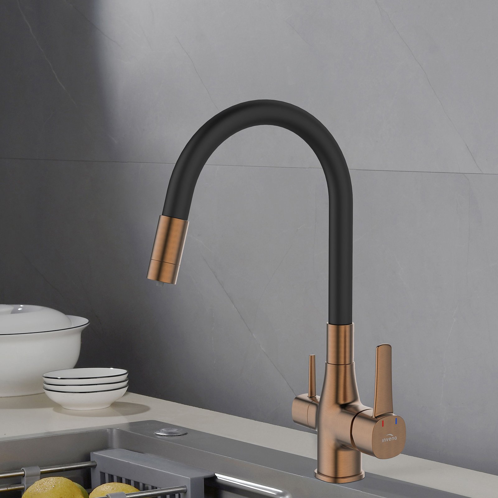 Ekologia, ergonomia i pełna funkcjonalność w kuchni to podstawa. Wszystkie te kryteria spełnia bateria kuchenna w komplecie z filtrem do wody. Takie rozwiązanie pozwala nam na zawsze pozbyć się dodatkowych butelek czy dzbanków, a woda która będziemy pić z kranu będzie w pełni zdatna do picia. Filtr węglowy wykorzystany w zestawie usuwa związki chloru, poprawia smak, zapach i klarowność wody wodociągowej. Pierwsza taka bateria z elastyczną wylewką, która dostępna jest w 3 wariantach kolorystycznych: czerń połączona z chromem, modna czerń oraz czerń połączona ze złotem. Elastyczna wylewka baterii połączona z możliwością filtrowania wody zapewni pełną funkcjonalność w kuchni. Dwa estetyczne uchwyty: jeden dla wody filtrowanej, drugi dla wody zwykłej ograniczą nadmierną eksploatacją filtra i pozwolą cieszyć się świeżą wodą pitną dokładnie w tym momencie, w którym jej potrzebujemy. Ten model zaproponowany przez markę Invena nie wymaga zmian w instalacji, zestaw zawiera wszystkie elementy niezbędne do montażu. Filtr należy wymieniać co pół rok lub po przepłynięciu 10000 litrów.