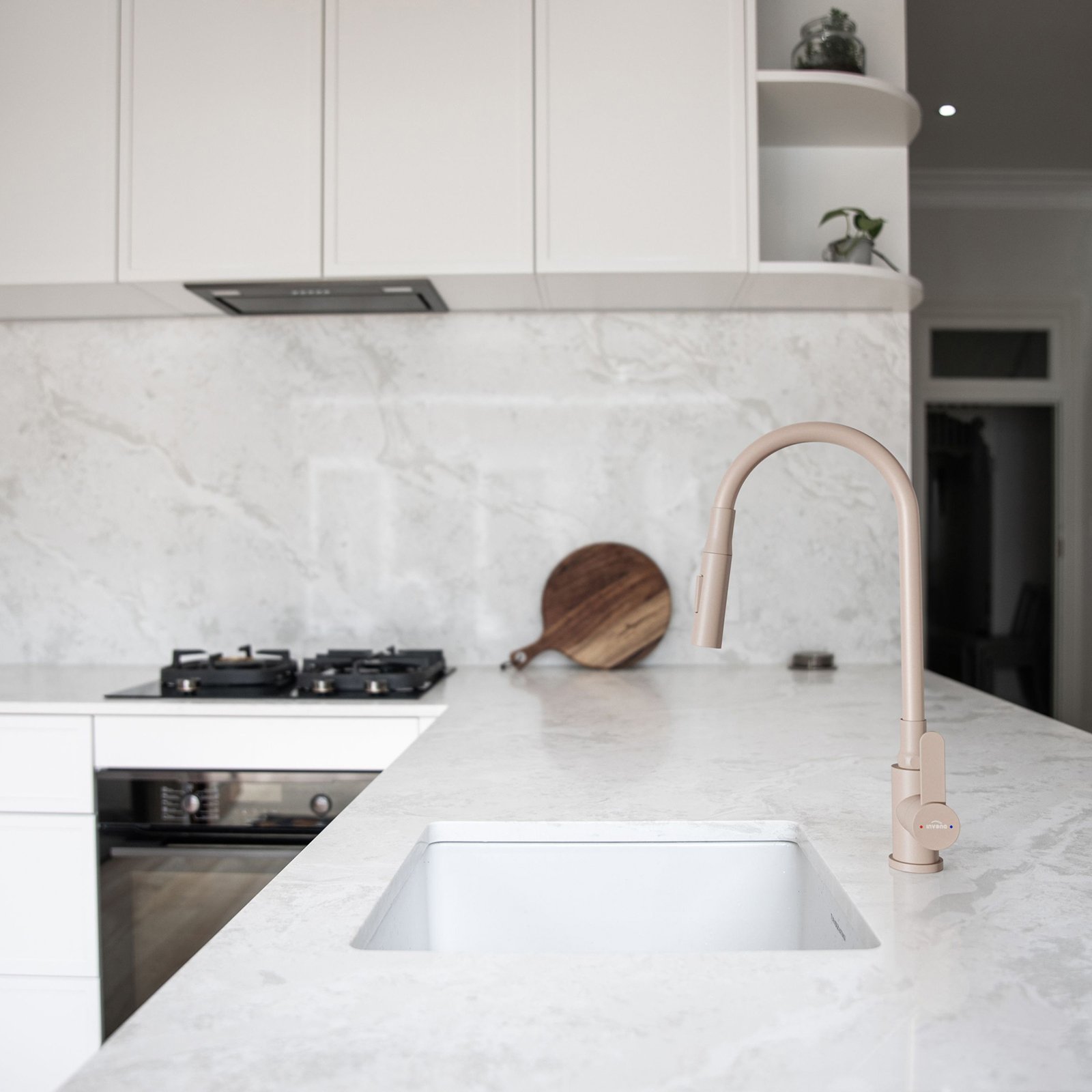 Bateria DALIS w kolorze beżowym to doskonały wybór do kuchni, w której liczy się zarówno estetyka, jak i funkcjonalność. Jej subtelna barwa wprowadza spokój i harmonię, idealnie komponując się z szeroką gamą stylów, od minimalistycznych po rustykalne. To bateria, która nie tylko wyróżnia się eleganckim wyglądem, ale także zapewnia wygodę użytkowania na co dzień. Bateria DALIS została wyposażona w ruchomą, elastyczną wylewkę, która daje pełną kontrolę nad kierunkiem strumienia wody. Dzięki niej, codzienne czynności w kuchni, takie jak mycie naczyń, płukanie warzyw czy czyszczenie zlewozmywaka, stają się prostsze i bardziej efektywne. Dwufunkcyjny przełącznik strumienia pozwala na łatwą zmianę trybu wody: strumień normalny – idealny do codziennych zadań, takich jak napełnianie garnków czy płukanie naczyń, z kolei spray – szeroki, delikatny strumień, nada się idealnie do mycia owoców, warzyw czy czyszczenia trudno dostępnych miejsc. Mieszacz ceramiczny 35 mm zapewnia precyzyjną regulację temperatury i ciśnienia wody, co sprawia, że korzystanie z baterii jest łatwe i przyjemne. Perlator oszczędzający wodę zmniejsza jej zużycie o nawet 50%, napowietrzając strumień i pozwalając na oszczędności w codziennym użytkowaniu. Solidne materiały – bateria wykonana jest z wysokiej jakości tworzyw, odpornych na zarysowania i wysoką temperaturę, co zapewnia jej długowieczność oraz estetyczny wygląd przez długi czas. Bateria DALIS charakteryzuje się systemem szybkiego montażu, który umożliwia błyskawiczną instalację. W zestawie znajdują się wężyki przyłączeniowe 3/8”, 45 cm (2 szt.), dzięki czemu bateria pasuje do większości standardowych instalacji. Montaż jest prosty, a efekt – spektakularny.