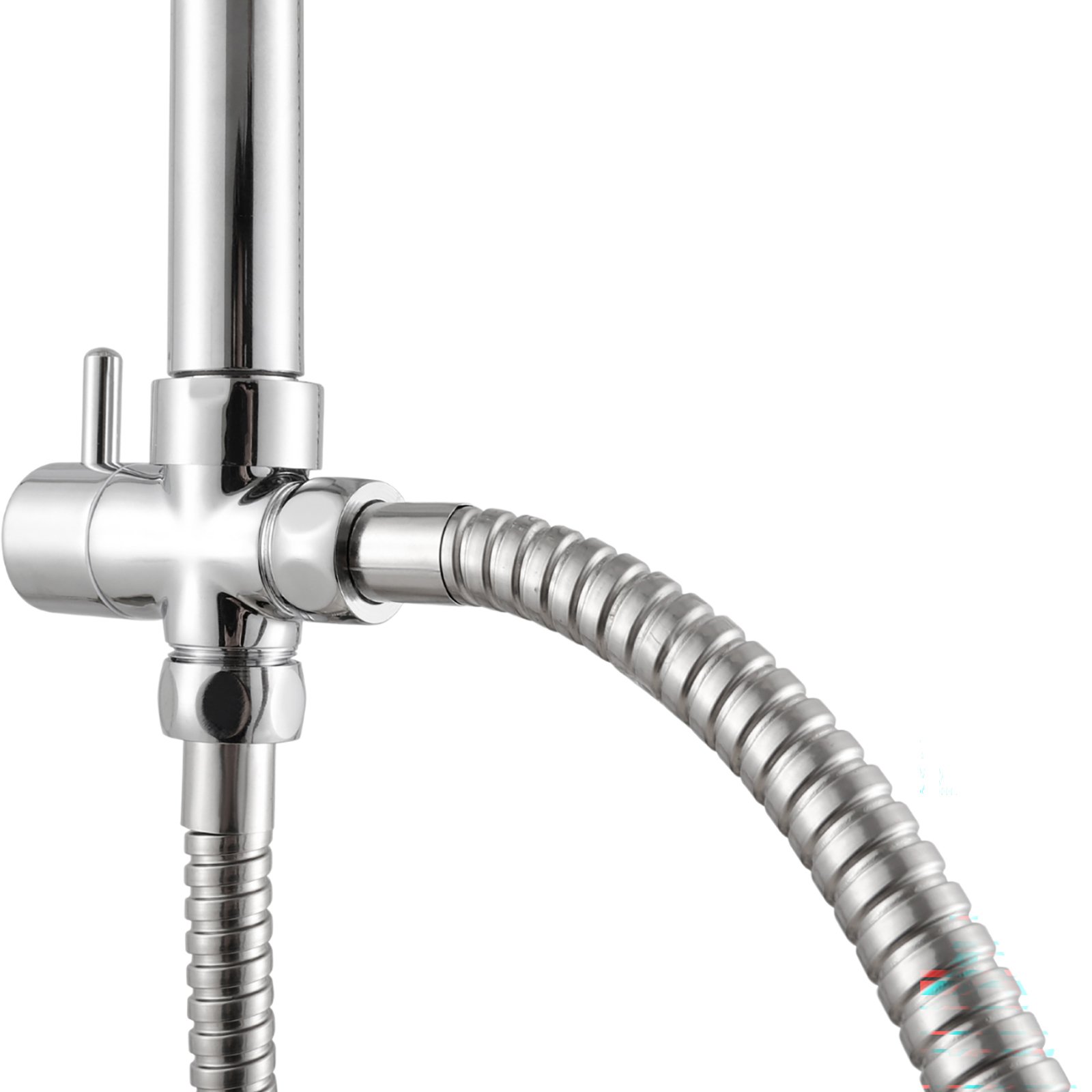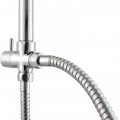 Zestaw z regulowanym uchwytem suwakowym oraz przyciskiem, o ręcznym przełączniku źródła wody, posiada stalowy wąż natryskowy o długości 150 cm oraz 60-centymetrowy wąż przyłączeniowy.