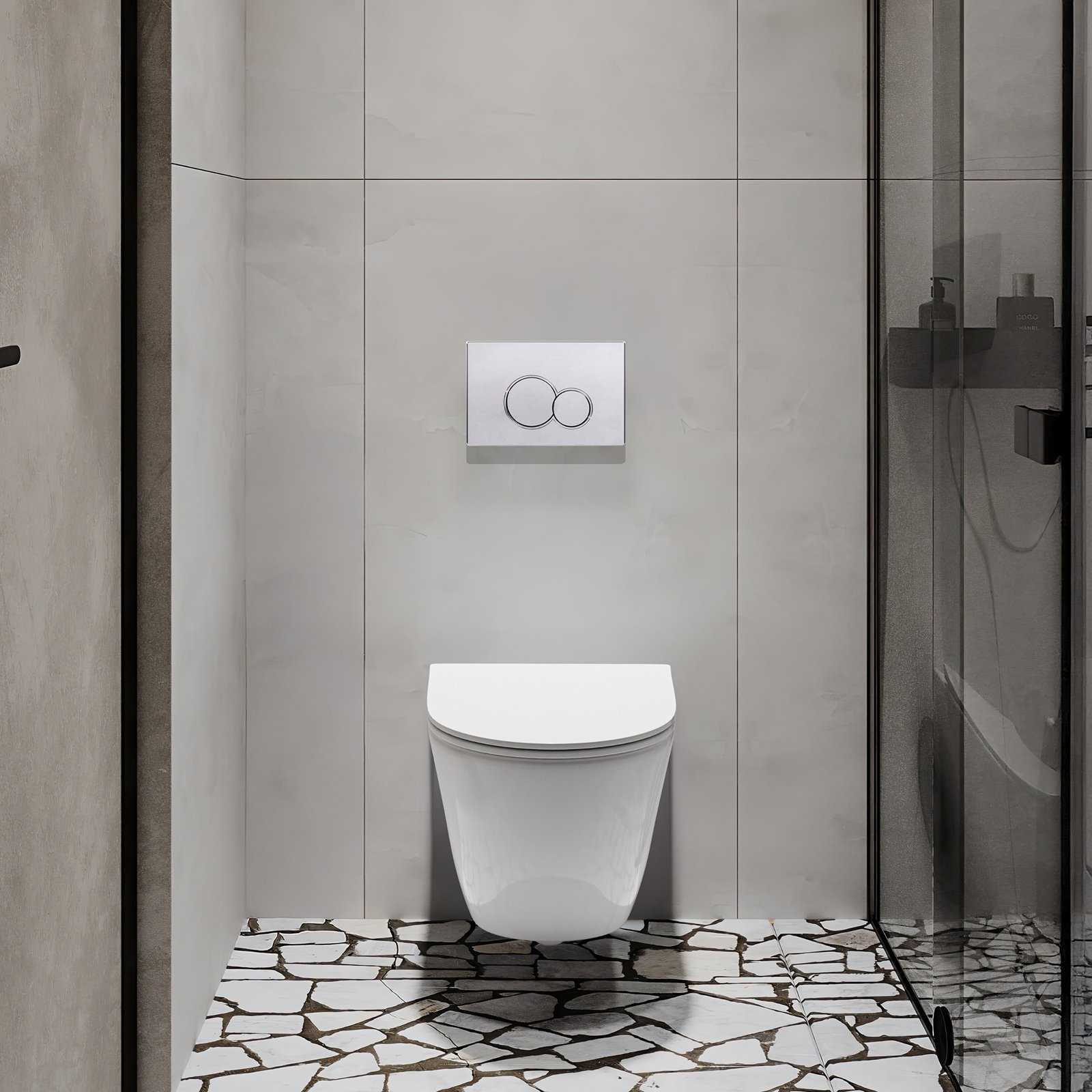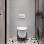 Zestaw WC TINOS z chromowanym przyciskiem 601 łączy elegancję z praktycznymi rozwiązaniami. Bezkołnierzowa miska (rimless) zapewnia maksymalną higienę i łatwość czyszczenia. Komfort użytkowania zwiększa deska slim wolnoopadająca z systemem szybkiego wypinania. Stelaż oferuje regulację wysokości, spłukiwanie 3/6 l oraz cichy zawór napełniający. Chromowany przycisk 601 nadaje całości nowoczesnego charakteru.
