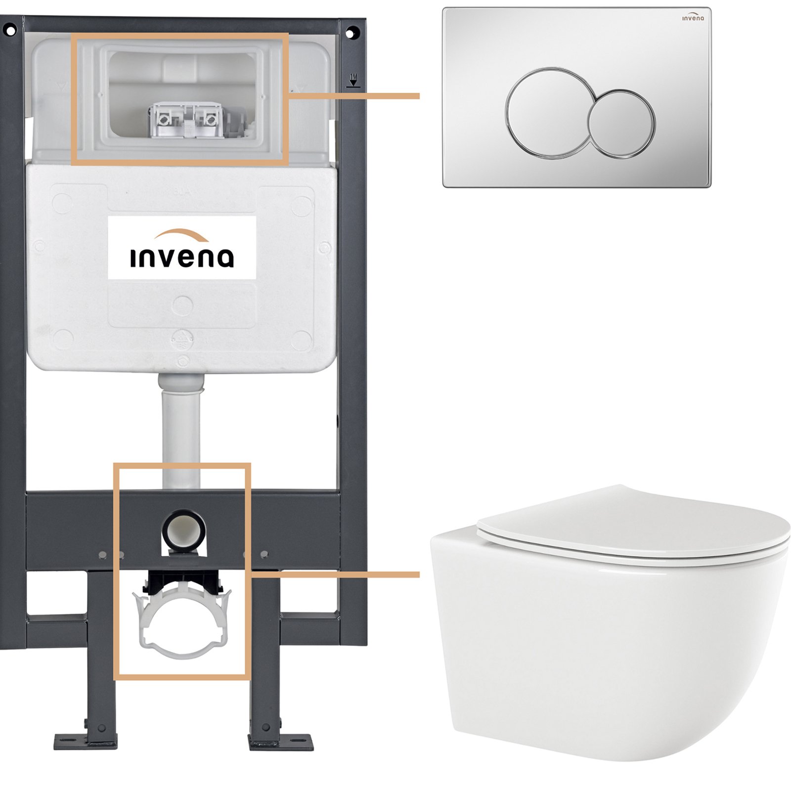 INVENA Zestaw podtynkowy 50 mechaniczny, miska TINOS, deska, przycisk 601 chrom CK-91-011