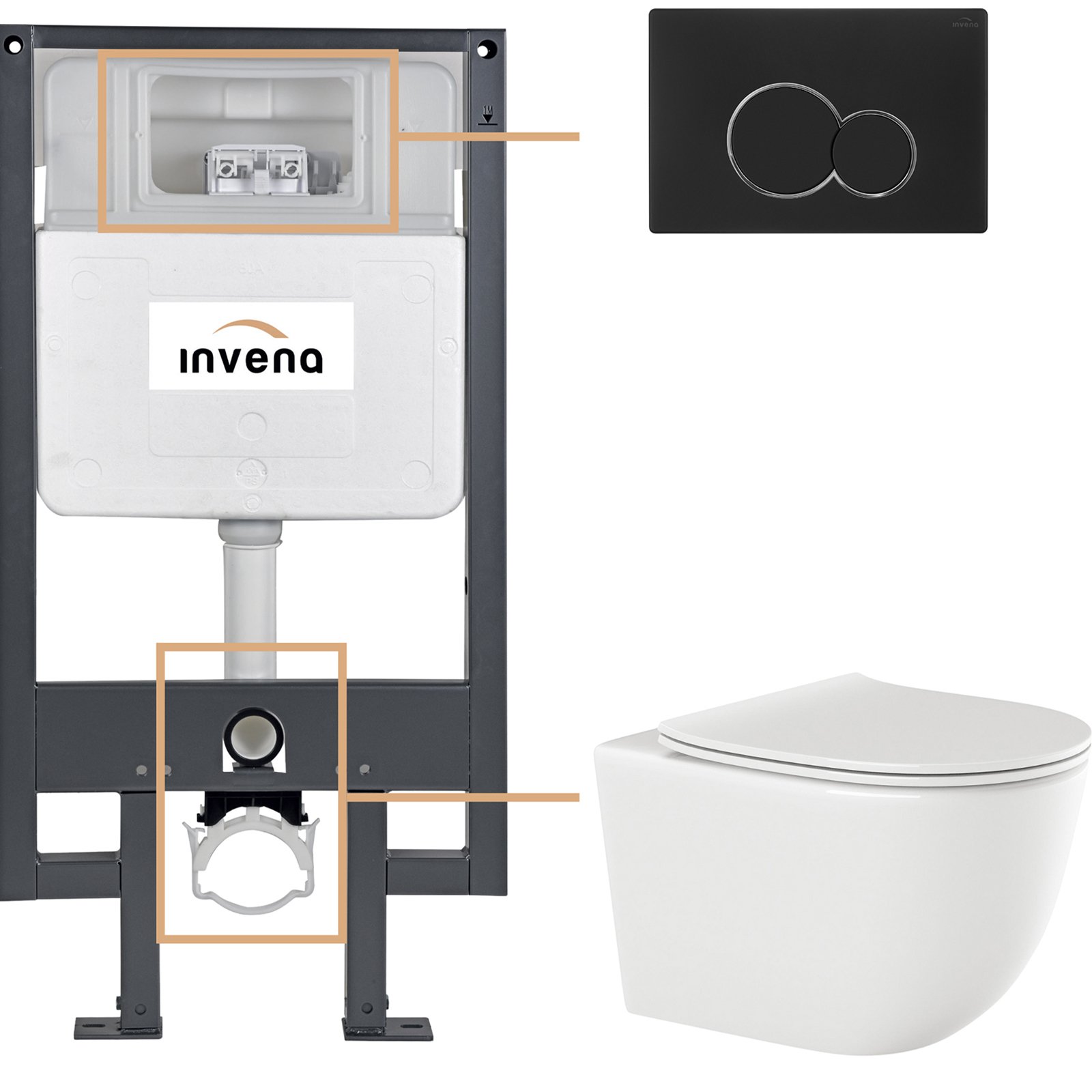 INVENA Zestaw podtynkowy 50 mechaniczny, miska TINOS, deska, przycisk 601 czarny CK-91-014