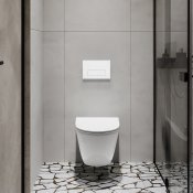 TINOS z białym przyciskiem 603 świetnie wpisuje się w minimalistyczne aranżacje. Miska rimless zapewnia łatwość utrzymania czystości i wysoką higienę użytkowania. Deska slim wolnoopadająca i szybkie wypinanie to praktyczne ułatwienia. Stabilny stelaż z wytrzymałością 400 kg oraz oszczędne spłukiwanie 3/6 l czynią zestaw niezawodnym.