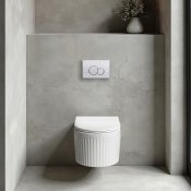 Zestaw WC Glamour w wersji z przyciskiem chrom to połączenie funkcjonalności i ponadczasowego stylu. Podwieszana, ryflowana miska Glamour zachwyca subtelnym designem, a dzięki desce wolnoopadającej slim z systemem łatwego wypinania codzienne użytkowanie staje się wyjątkowo wygodne. Cichy system spłukiwania QFS gwarantuje komfort i dyskrecję, a oszczędne spłukiwanie 3/6 l pozwala na realne zmniejszenie zużycia wody. Stelaż podtynkowy z cichym zaworem napełniającym, wytrzymałością do 400 kg i możliwością regulacji wysokości do 20 cm to solidna baza, która zapewnia bezpieczeństwo i trwałość na lata. Całość uzupełnia chromowany przycisk – lśniący i elegancki akcent, który pięknie komponuje się z każdym wnętrzem.
