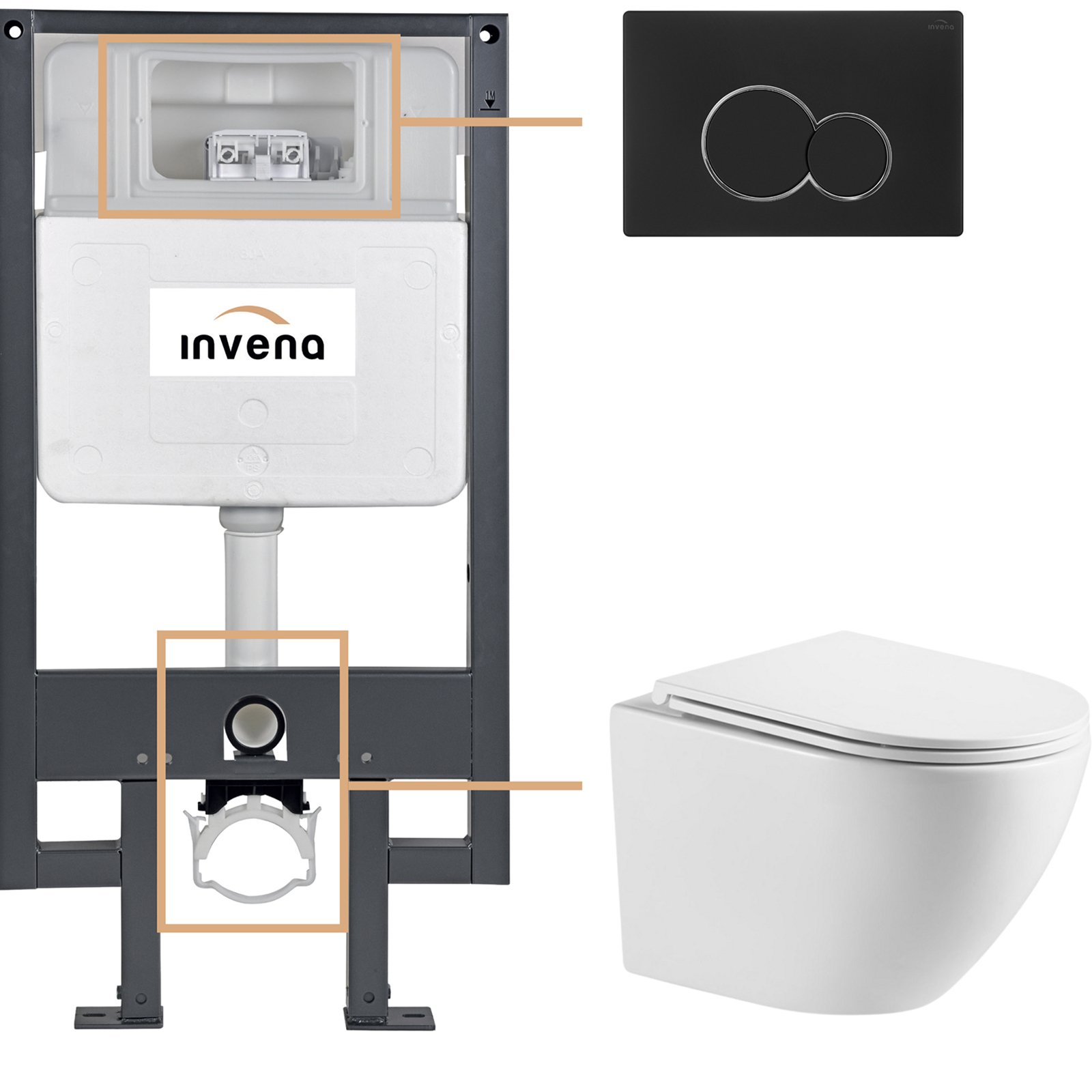 INVENA Zestaw podtynkowy 50 mechaniczny, miska LIMNOS, deska, przycisk 601 czarny CK-93-014
