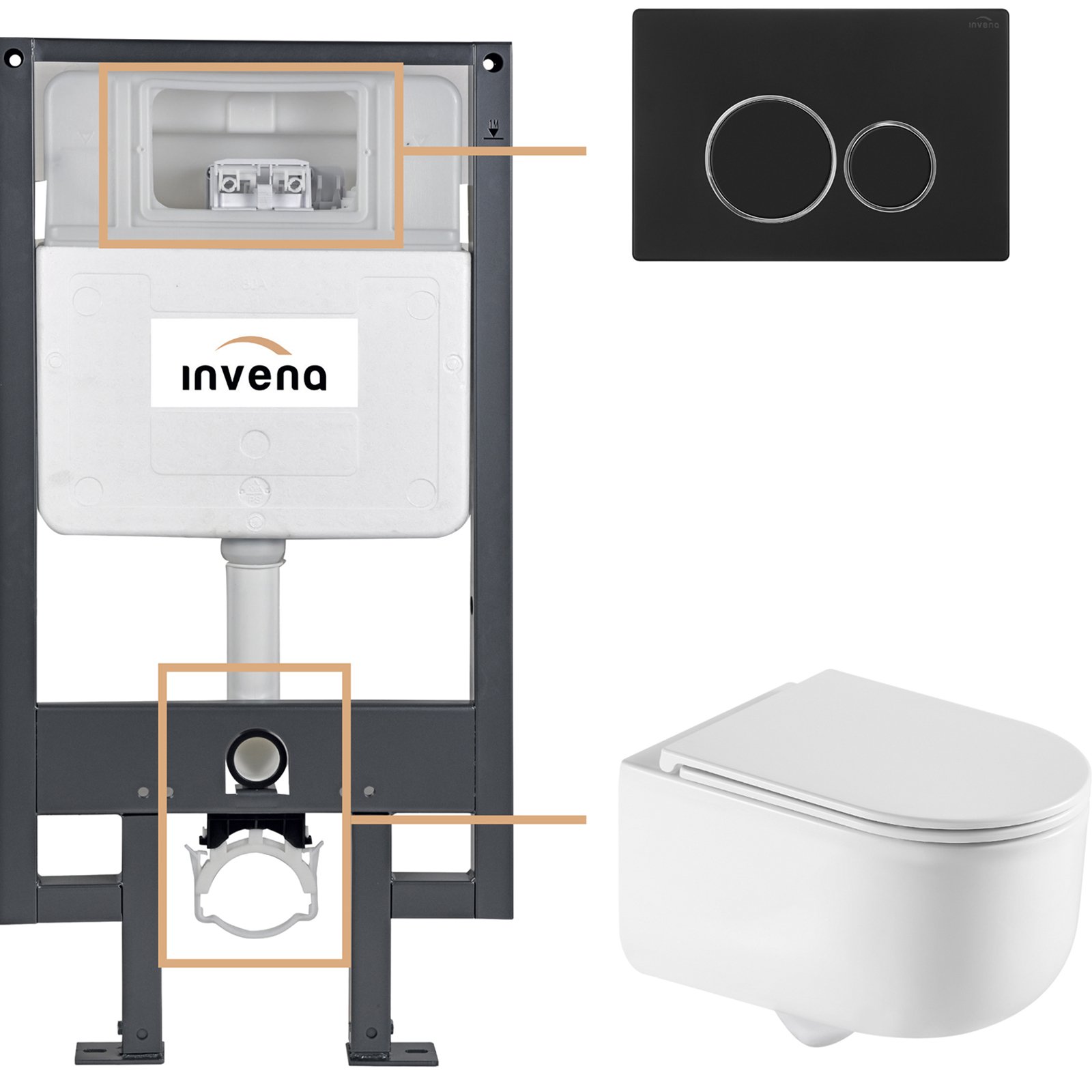 INVENA Zestaw podtynkowy 50 mechaniczny, miska KORFU, deska, przycisk 604 czarny CK-95-044