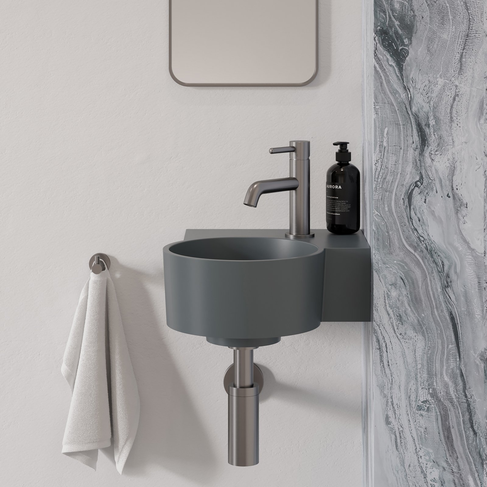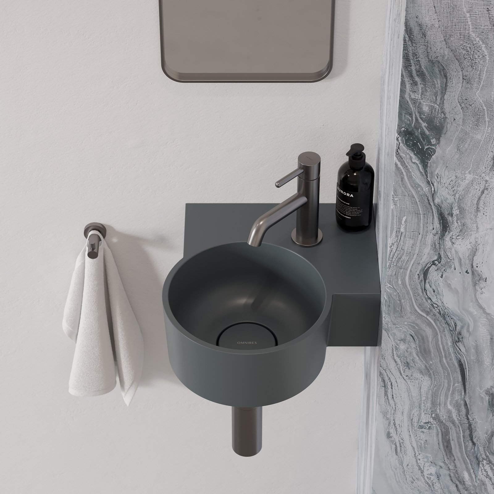 OVO w kolorze ash grey (RAL7022) to umywalka w eleganckim odcieniu ciepłej szarości, o aksamitnej w dotyku, matowej powierzchni.