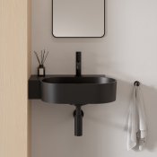 OVO w kolorze black lava (RAL9005) to umywalka w wyrazistym odcieniu czerni, o aksamitnej w dotyku, matowej powierzchni.