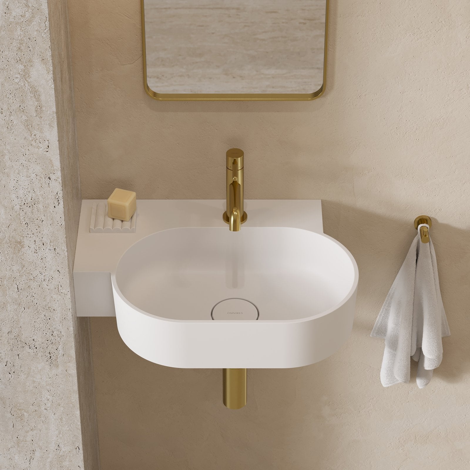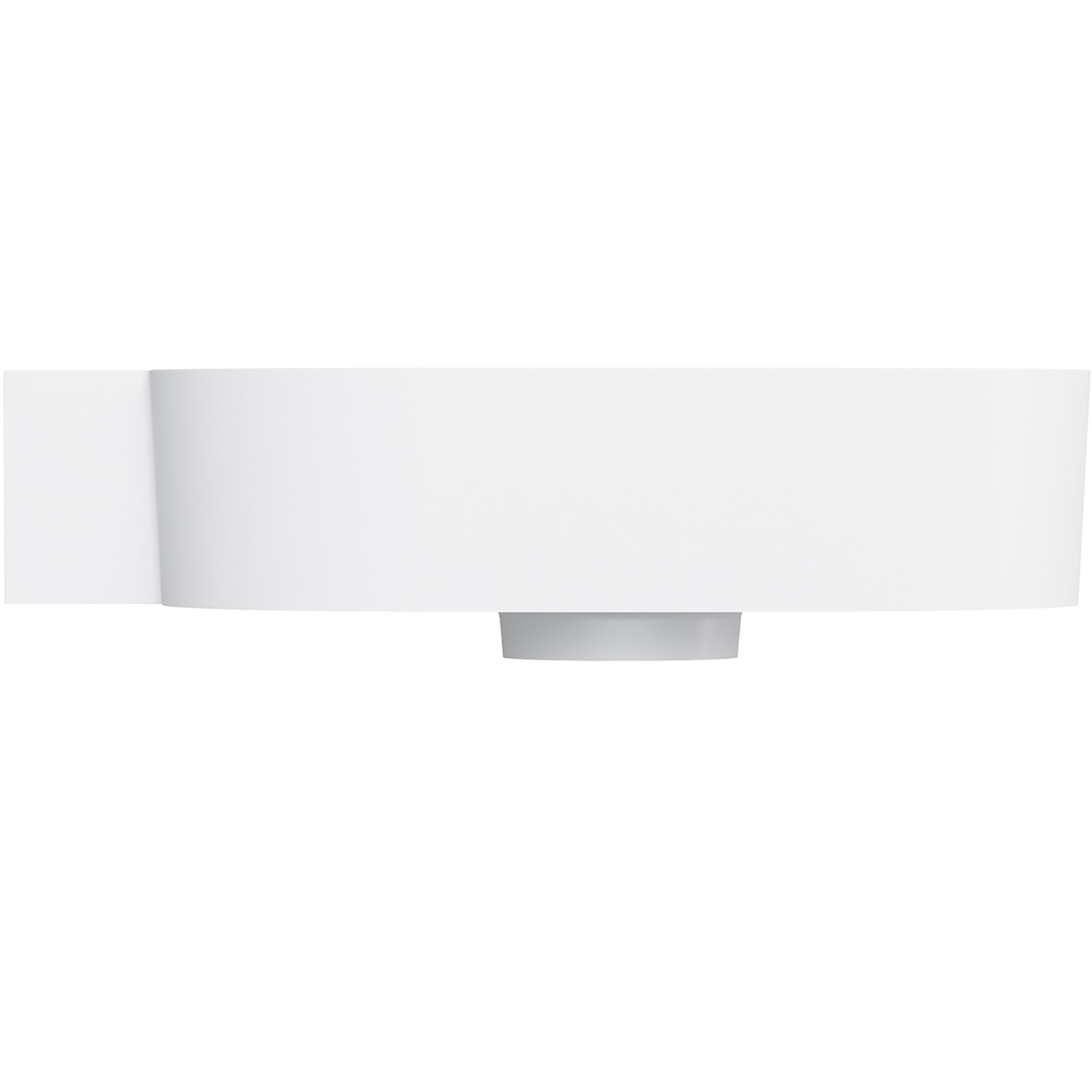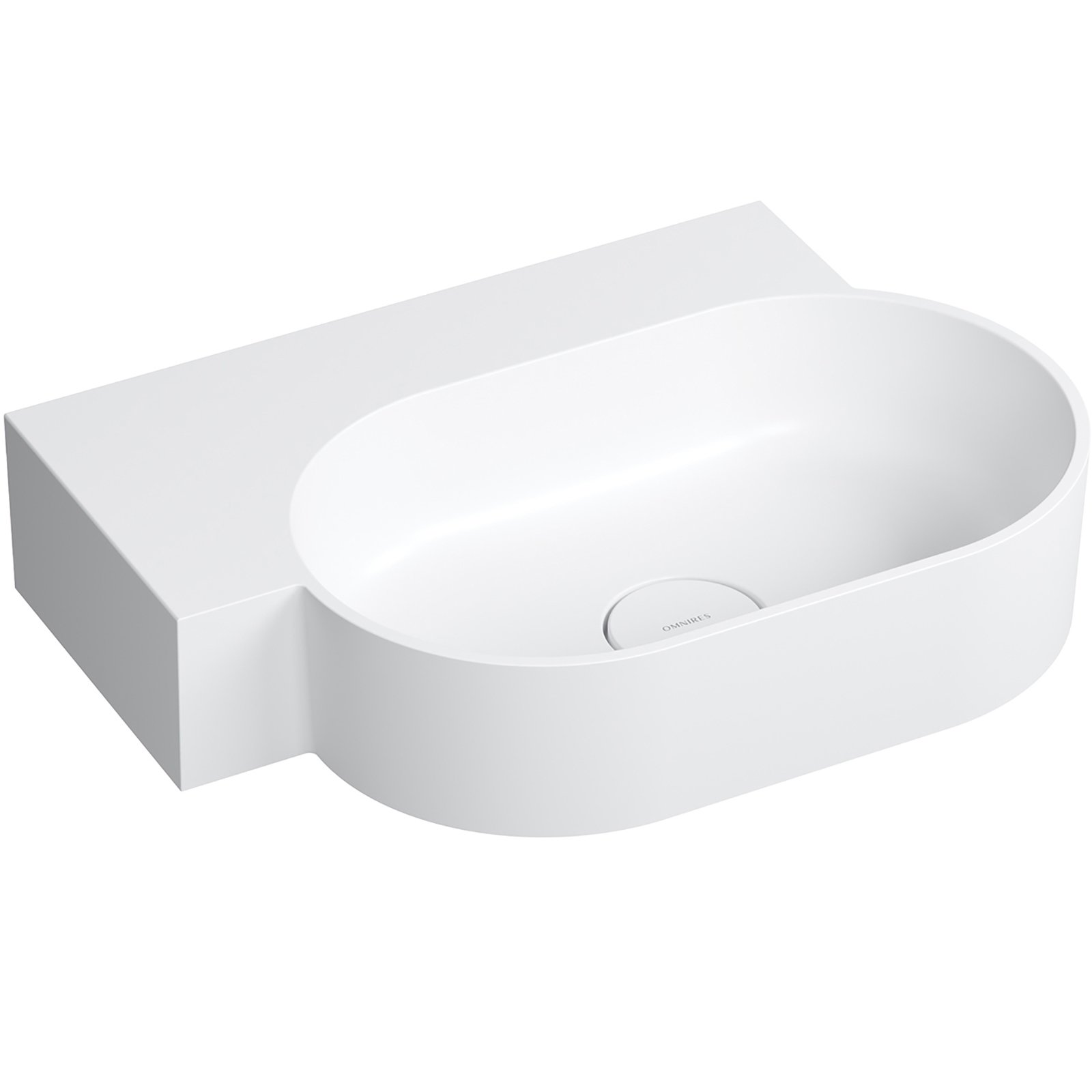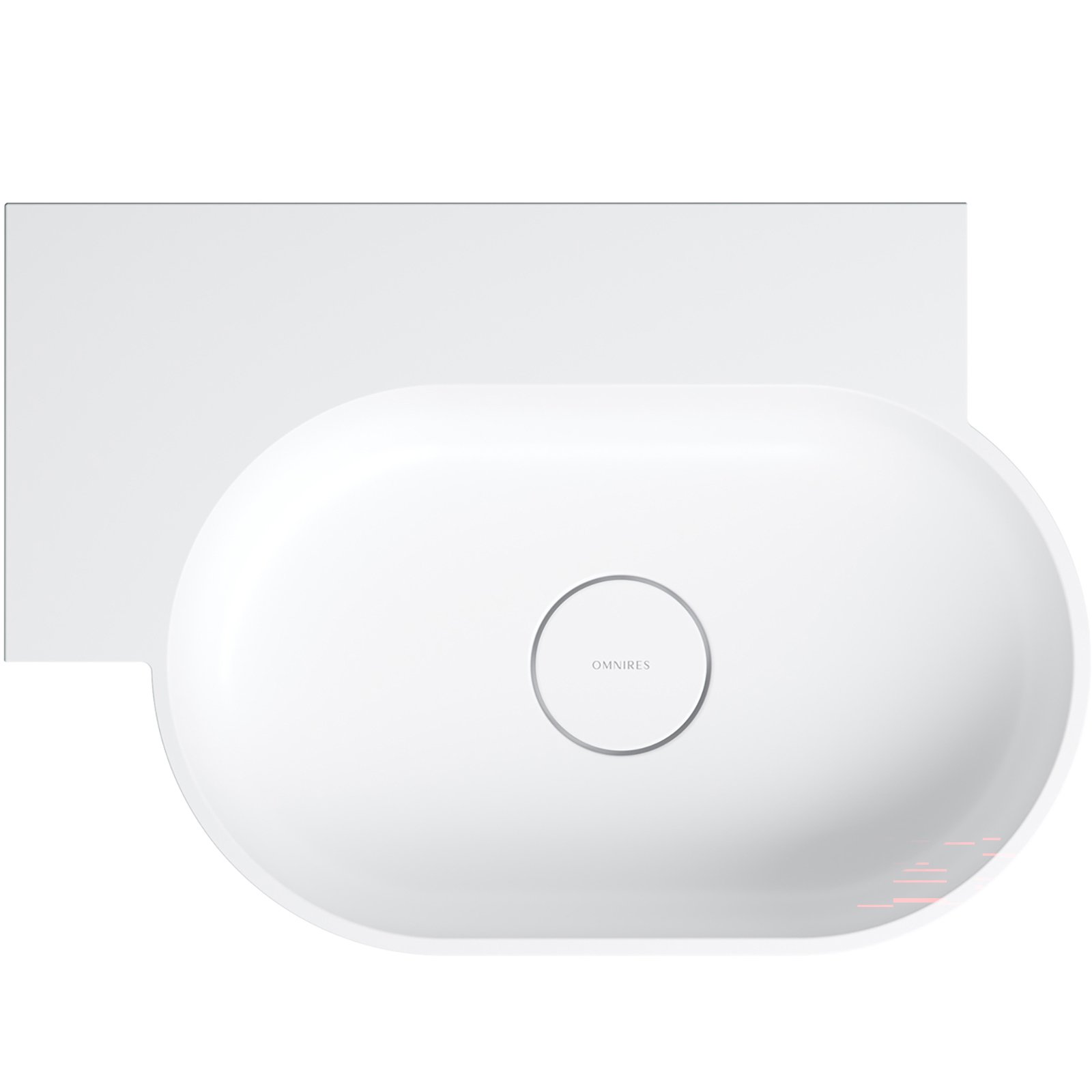 Umywalka z kolekcji OMNIRES OVO charakteryzuje się minimalistyczną, wyrazistą formą o doskonałych proporcjach. Powstały z zabawy geometrią kształt tworzą dwa przeciwległe półokręgi umywalki, połączone z prostokątną, funkcjonalną półką – idealnym miejscem do montażu baterii, a także do odstawienia kosmetyków czy innych niezbędnych akcesoriów. Harmonijnie wyprofilowane ścianki zostały wykończone płaskim, podkreślającym formę rantem, a idealnie dopasowana maskownica odpływu gwarantuje najwyższą estetykę. Od spodu umywalki zaprojektowano dyskretny, fabrycznie podcieniony punkt, który wskazuje miejsce na wykonanie otworu pod baterię.