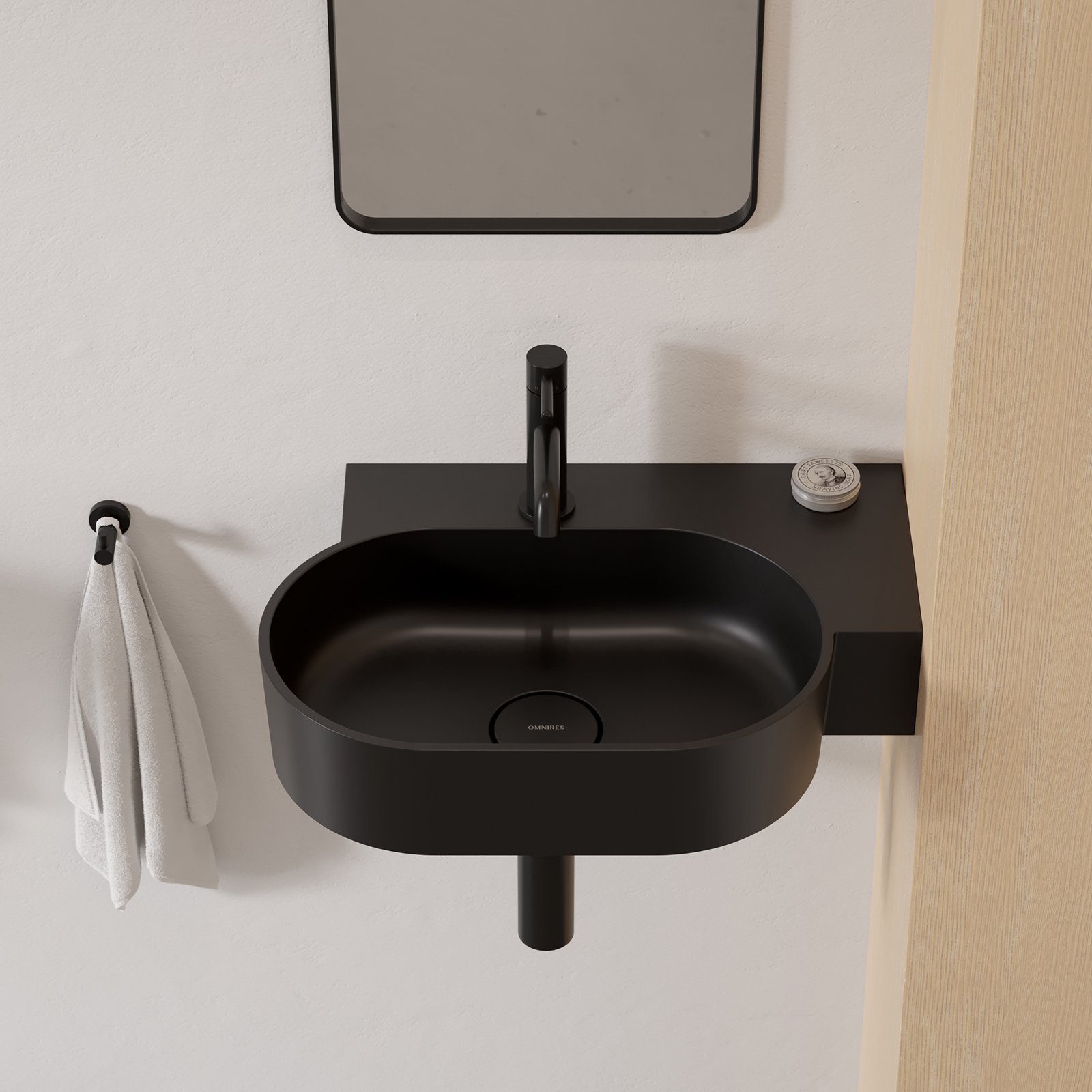 OVO w kolorze black lava (RAL9005) to umywalka w wyrazistym odcieniu czerni, o aksamitnej w dotyku, matowej powierzchni.