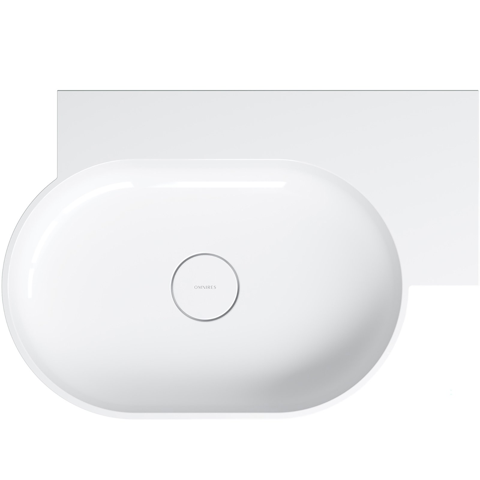 Umywalka z kolekcji OMNIRES OVO charakteryzuje się minimalistyczną, wyrazistą formą o doskonałych proporcjach. Powstały z zabawy geometrią kształt tworzą dwa przeciwległe półokręgi umywalki, połączone z prostokątną, funkcjonalną półką – idealnym miejscem do montażu baterii, a także do odstawienia kosmetyków czy innych niezbędnych akcesoriów. Harmonijnie wyprofilowane ścianki zostały wykończone płaskim, podkreślającym formę rantem, a idealnie dopasowana maskownica odpływu gwarantuje najwyższą estetykę. Od spodu umywalki zaprojektowano dyskretne, fabrycznie podcienione punkty, które wskazują miejsca na wykonanie otworów pod baterię lub dozownik, umożliwiając elastyczne dopasowanie armatury do indywidualnych potrzeb.?