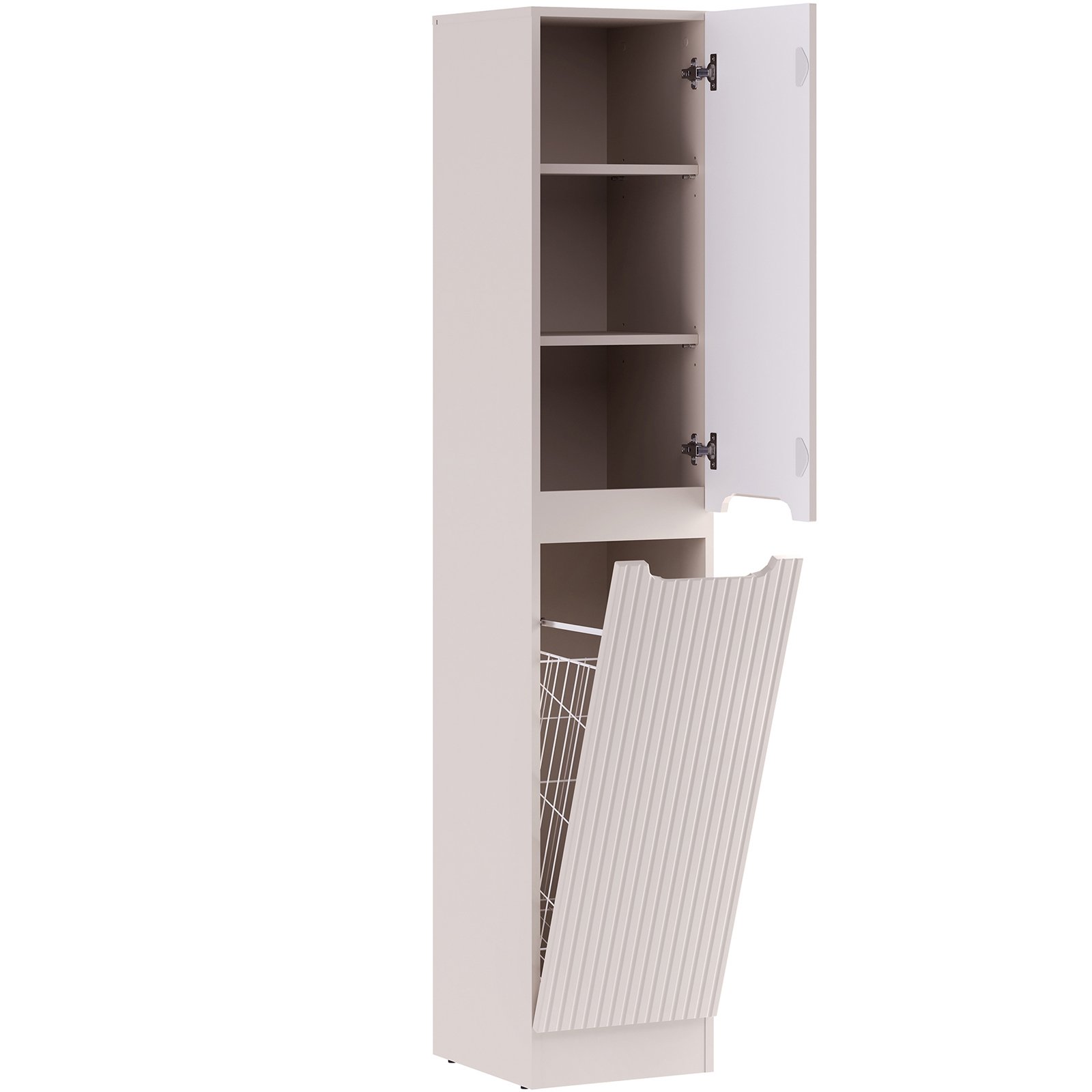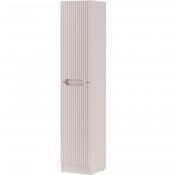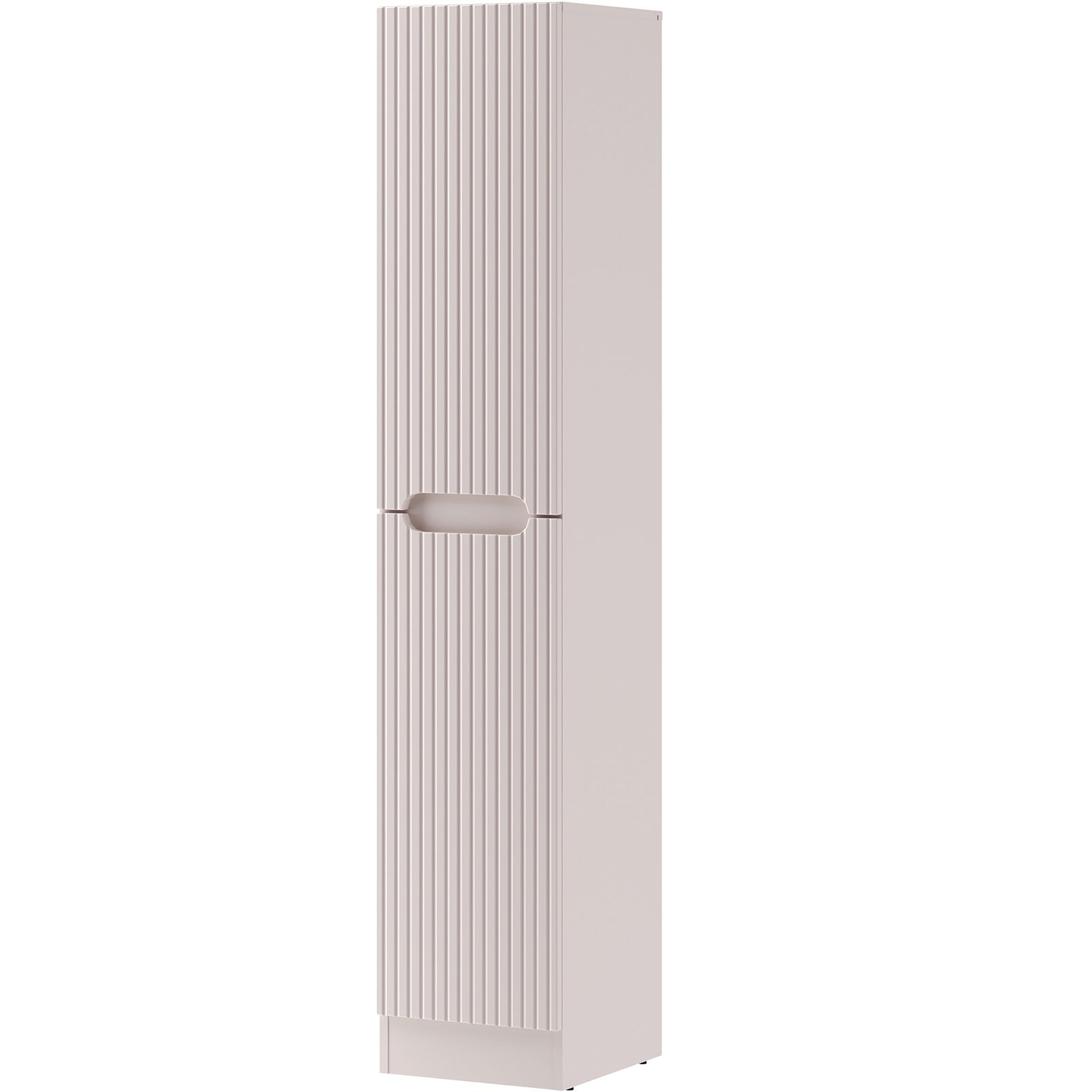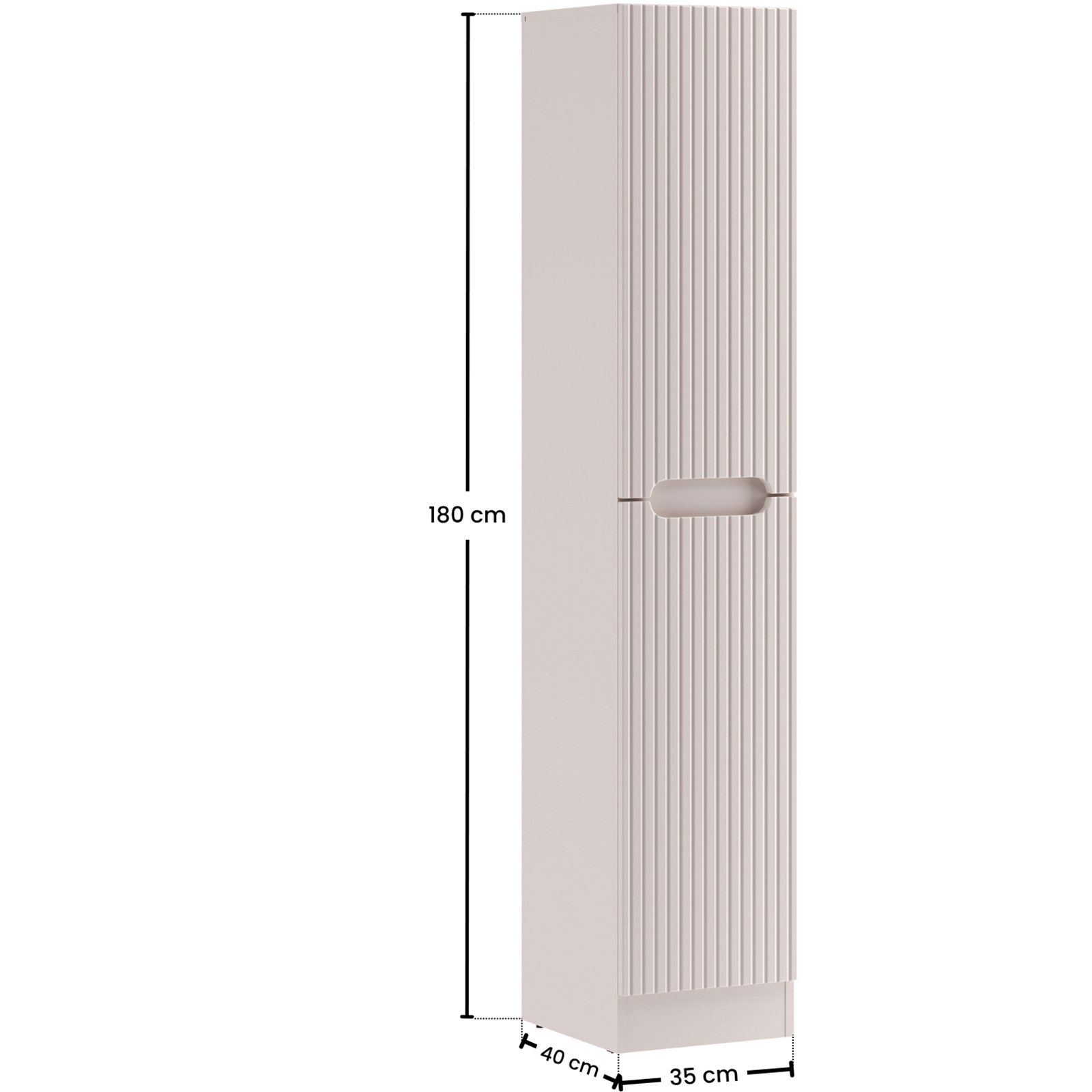 Słupek z kolekcji Nova Cashmere przyciąga wzrok eleganckim minimalizmem, wyrazistymi pionowymi ryflowaniami i perfekcyjnie zintegrowanym podchwytem, który subtelnie podkreśla ponadczasowy charakter mebli. Delikatny dekor Kaszmirowy Beż wprowadza do wnętrza łagodną, ciepłą atmosferę. Szafka o wysokości 180cm z trzema półkami i pojemnym koszem na pranie to praktyczne rozwiązanie, które oferuje dużo miejsca i ułatwia organizację przestrzeni. Wykonana z płyty laminowanej i płyty MDF, zapewnia trwałość i estetykę na lata. Zastosowany system cichego domykania podnosi komfort codziennego użytkowania i podkreśla wysoką jakość wykonania.
