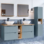 Dwie szafki pod umywalkę z dwiema szufladami z kolekcji Nova Denim przyciągają wzrok eleganckim minimalizmem. Wyraziste pionowe ryflowania i perfekcyjnie zintegrowany podchwyt, subtelnie podkreślają ponadczasowy charakter mebli. Głęboki, nasycony dekor Denim Suedette nadaje wnętrzu wyrazistości i indywidualnego stylu.