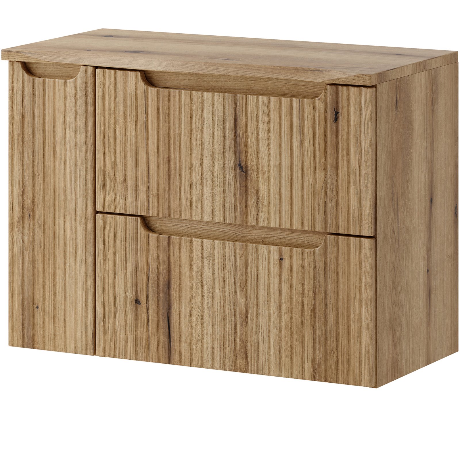 Szafka pod umywalkę 60 cm z dwiema szufladami z kolekcji Nova Coast Evoke przyciąga wzrok eleganckim minimalizmem, wyrazistymi pionowymi ryflowaniami i perfekcyjnie zintegrowanym podchwytem, który subtelnie podkreśla ponadczasowy charakter mebli. Ciepły odcień i naturalna struktura dekoru Dąb Coast Evoke sprawiają, że wnętrze nabiera miękkiego, przytulnego charakteru.