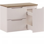 Szafki o łącznej szerokości 80 cm z kolekcji Nova Cashmere przyciąga wzrok eleganckim minimalizmem. Delikatny dekor Kaszmirowy Beż wprowadza do wnętrza łagodną, ciepłą atmosferę.
