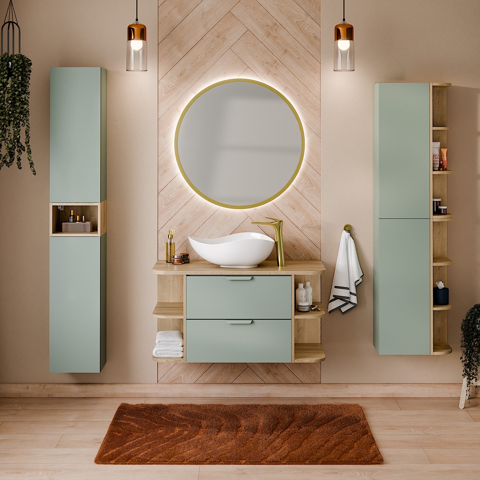Szafka łazienkowa wisząca ASTER GREEN 30 cm, regał CREMONA 15 cm