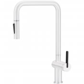 Bateria kuchenna Momi, wykonana z wytrzymałej stali nierdzewnej, wyróżnia się prostokątną wylewką, która nadaje jej wyjątkowego charakteru. Dzięki wbudowanemu aeratorowi, woda jest napowietrzana, co pozwala zredukować jej zużycie. Wyciągana wylewka zapewnia wygodę w codziennym użytkowaniu, umożliwiając swobodne manewrowanie wodą podczas czynności w strefie zlewozmywaka. Dodatkowo, bateria posiada dwa rodzaje strumienia: napowietrzony do codziennego mycia oraz delikatny strumień deszczowy, doskonały do płukania warzyw i owoców. Bateria Momi, wykończona w matowym, białym kolorze wprowadza do kuchni subtelną elegancję i nowoczesną lekkość.