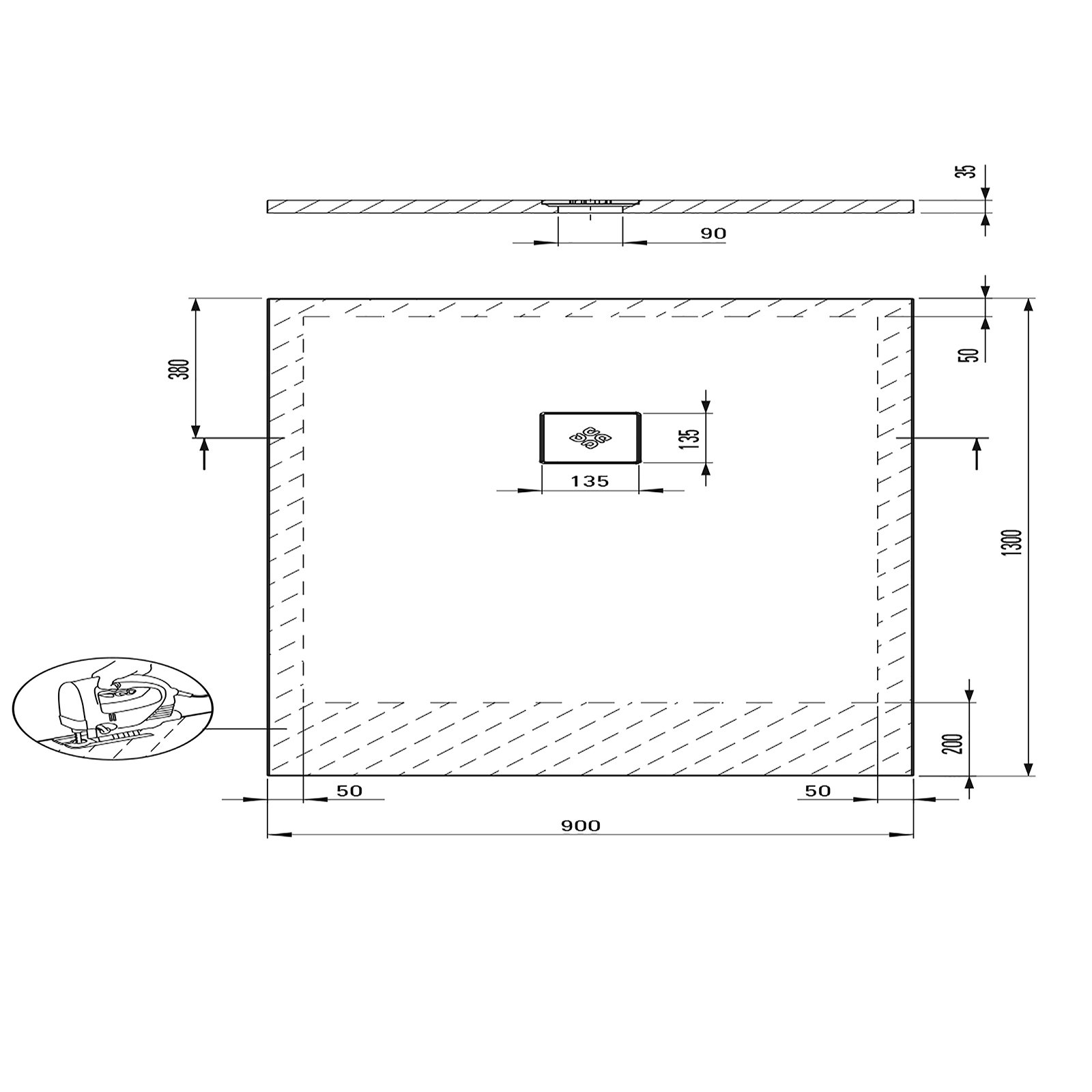 Kształt: prostokątny Materiał: akryl Wykończenie: biały Długość: 130cm Wysokość: 3,5cm Sposób montażu: na podparciu materiałem konstrukcyjnym, bezpośrednio na wylewce, na poziomie podłogi Szerokość: 90cm Średnica odpływu: 90mm Możliwość docięcia: tak Występy antypoślizgowe: tak