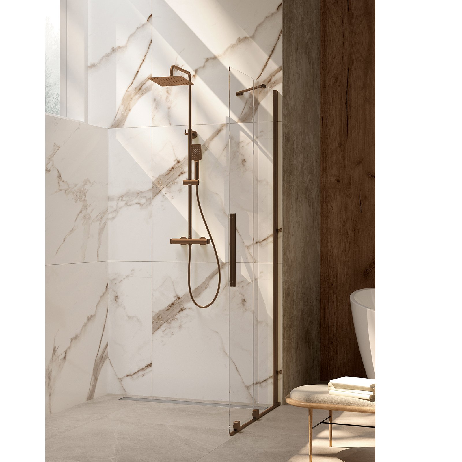 Model prysznicowy Prizma, z przesuwną konstrukcją, idealnie dostosowuje się do nowoczesnych i kompaktowych łazienek, zapewniając efektywne wykorzystanie przestrzeni oraz komfort użytkowania. Przesuwne drzwi są tak zaprojektowane, aby maksymalizować dostępną przestrzeń. Matowe, brązowe wykończenie tworzy harmonijną całość z armaturą w kolorze szczotkowanego brązu.