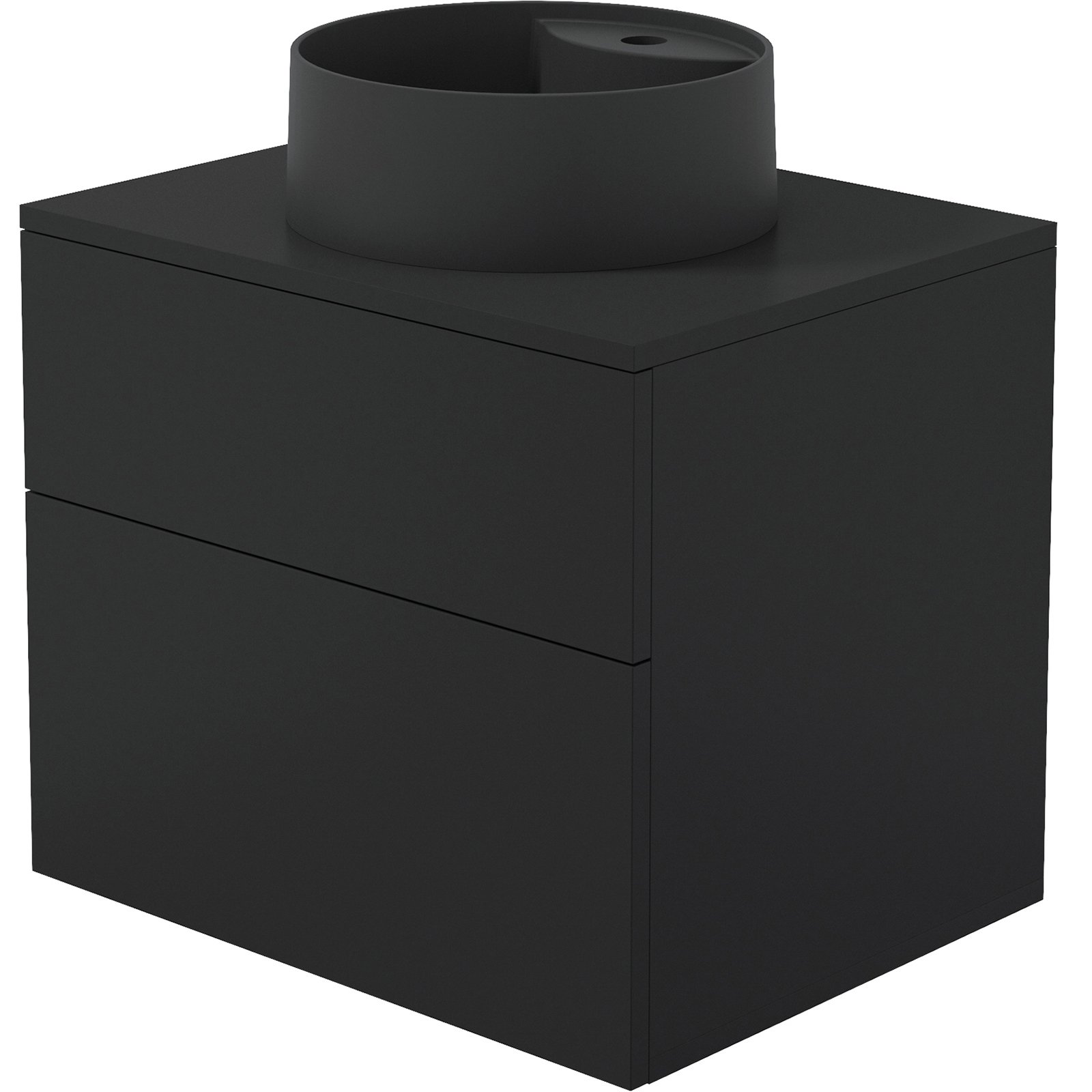 Zestaw łazienkowy łączy w sobie okrągłą umywalkę granitową Silia w głębokim czarnym kolorze oraz szafkę Prizma wykończoną w matowej czerni, tworząc spójną i nowoczesną kompozycję. Ta połączenie barw tworzy elegancką, minimalistyczną przestrzeń, która doskonale sprawdzi się zarówno w większych, jak i mniejszych łazienkach. Umywalka zachwyca gładką powierzchnią bez przelewu, co ułatwia utrzymanie jej w czystości, a wbudowana wyspa pozwala na wygodny montaż baterii. Jej kompaktowe wymiary łączą estetykę z wyjątkową praktycznością. Szafka w matowej czerni harmonijnie współgra z granitową umywalką, podkreślając nowoczesny charakter zestawu. Dwie pojemne szuflady z pełnym wysuwem i cichym domykiem zapewniają komfort codziennego użytkowania, a system push to open akcentuje innowacyjny styl mebla. Blat z otworem na syfon został perfekcyjnie dopasowany do umywalki, tworząc jednolitą i elegancką całość.