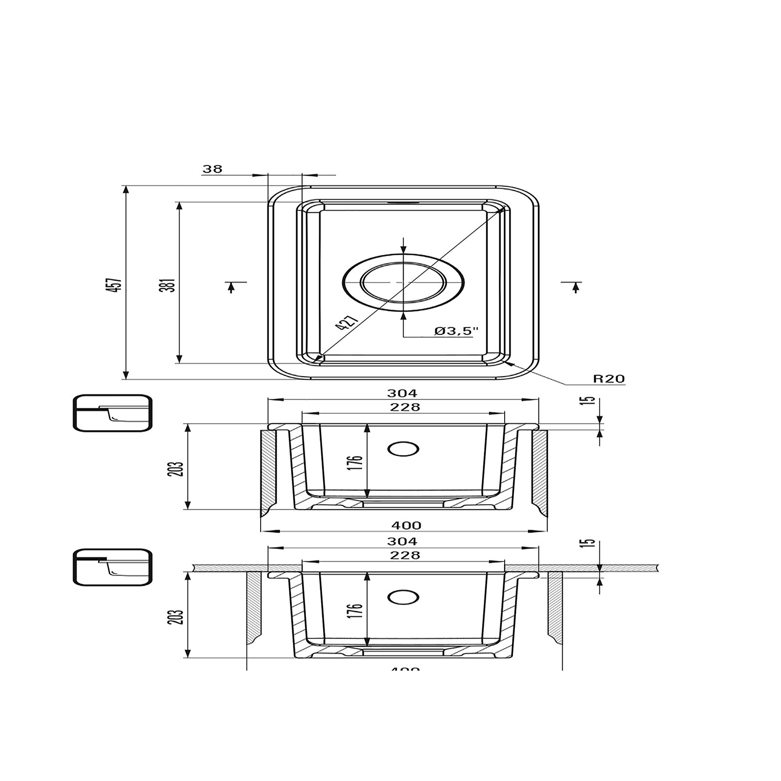 Materiał: ceramika Odwracalny: tak Wykończenie: biały Długość: 30,4cm Wysokość: 20,3 Odwracalny: tak Miejsce przelewu: w komorze Sposób montażu: wpuszczany, podblatowy Szerokość: 45,7cm Rodzaj powierzchni: błysk Ilość komór zlewozmywaka: 1 Minimalna szerokość szafki: 40cm