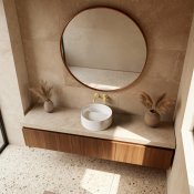 Umywalka nablatowa Elara w wersji okrągłej to propozycja dla miłośników harmonijnej formy i nowoczesnej estetyki. Jej idealnie wyważone proporcje oraz miękka linia doskonale komponują się z eleganckimi blatami łazienkowymi, tworząc subtelny, a jednocześnie wyrazisty akcent aranżacyjny.