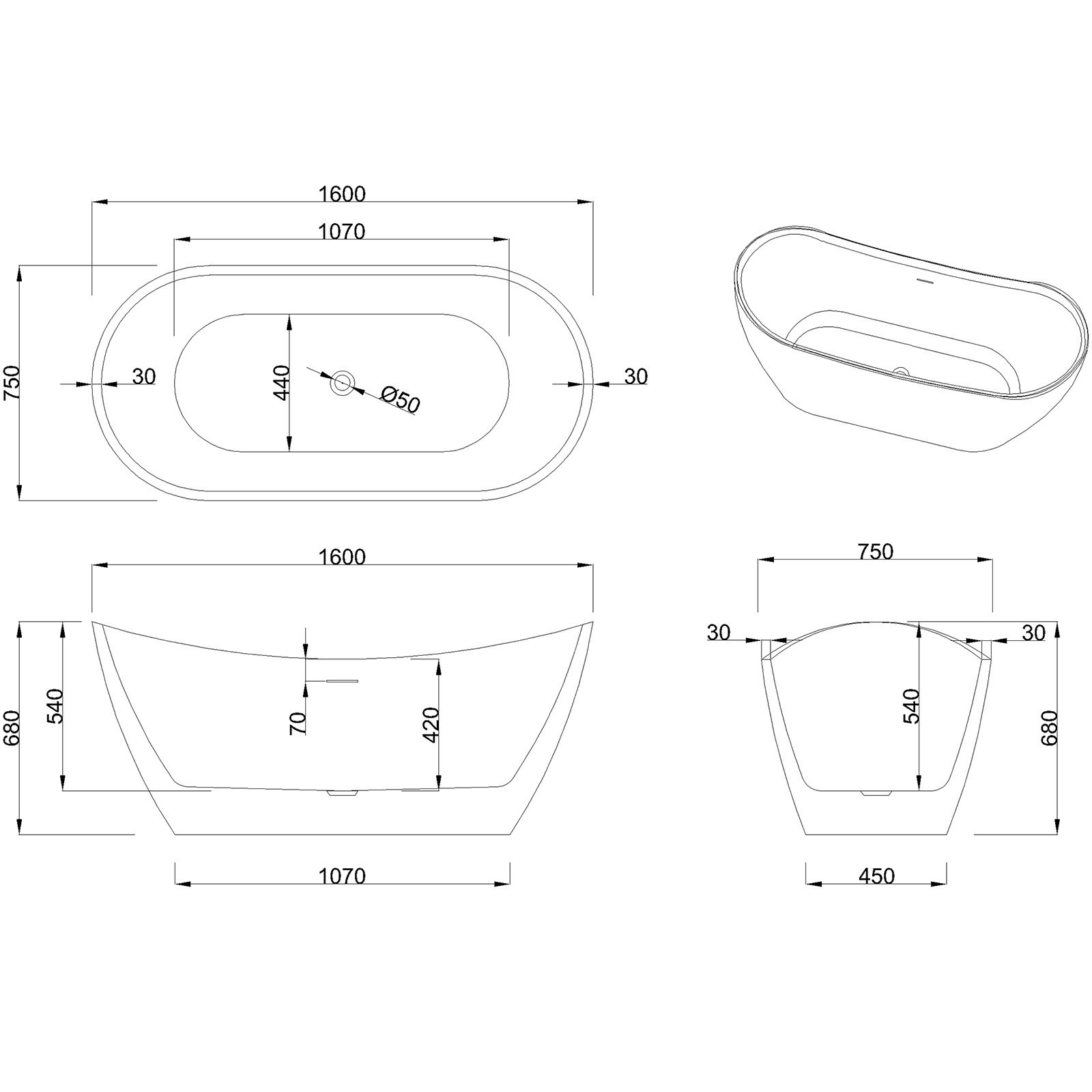 Wanna wolnostojąca ASTRI 160x75 cm z syfonem