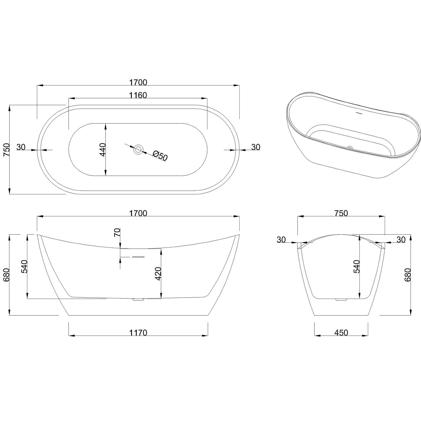 Wanna wolnostojąca ASTRI 170x75 cm z syfonem